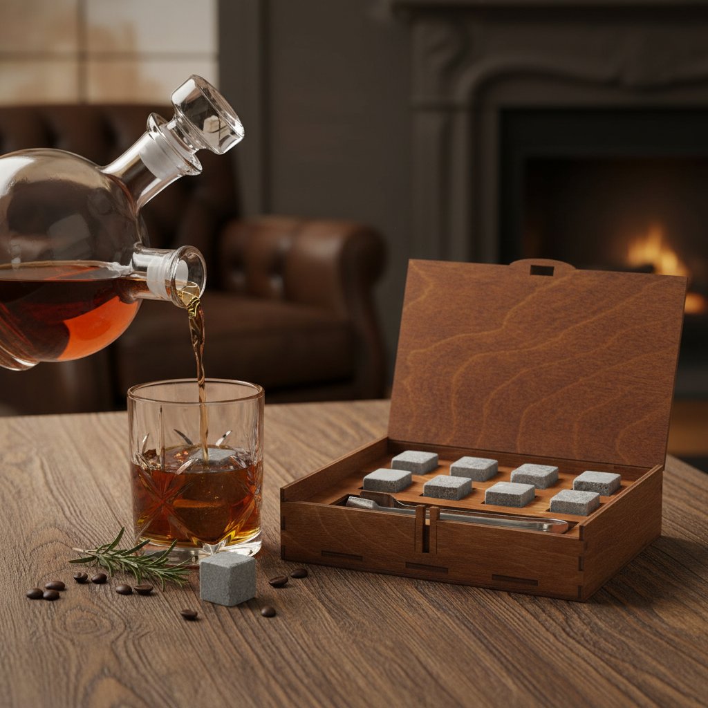 | Комплектация | - два бокала для виски; - восемь камней для виски; - щипцы; - деревянный футляр для камней. |