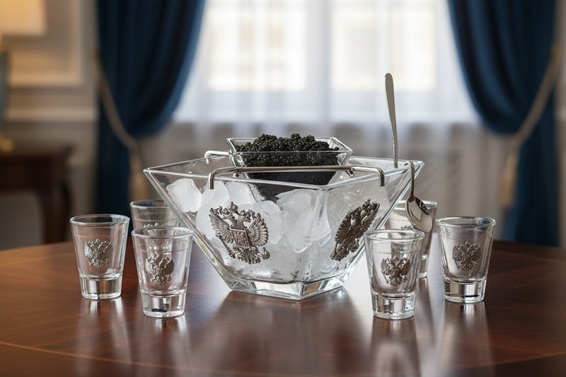 В дополнение к необычным рюмкам в комплект включена икорница для соответствующего деликатеса с дополнительной чашей, так называемой, «подыкорницей», куда помещается лед, поддерживающий оптимальную прохладу рыбного продукта. Подыкорница оснащена металлическим держателем малого блюдца квадратной формы и специальной ложечкой с длинной изогнутой ручкой, которую легко закрепить на краю большей чаши со льдом. Таким образом, боярский прием будет в полной мере соответствовать своему «названию».