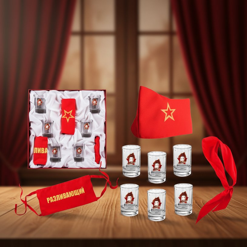 Ирония прослеживается и в других составляющих набора для водки «Пионерский отряд». Например, в его составе есть пионерский галстук, с помощью которого кого-нибудь из компании можно символически принять в пионеры. А кому-то из участников застолья достанется головной убор пионера: пилотка. И все же самый главный среди присутствующих – это «разливающий». Несомненно, это человек, следящий за своевременным наполнением стопок спиртными напитками, а также носитель нарукавной повязки с аналогичной надписью. Все аксессуары из набора выполнены в красной цветовой гамме, чтобы поддержать тему пионерства.