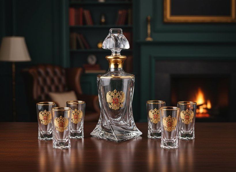 Вошедший в состав набора стеклянный графин создан руками и талантом опытных отечественных стеклодувов из Ивановской области. Его необычная танцующая форма помогает создавать ощущение яркого праздника. Верхняя часть графина облагорожена двумя стильными золотыми ободками – узким на «плечах» и широким на горлышке. На лицевую сторону графина нанесен сияющий российский герб.
