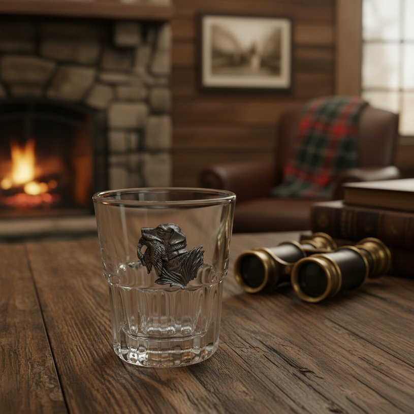 Необычным и тематическим подарком данный набор всё же делают металлические накладки, изготовленные мастерами вручную по способу художественного литья. Чтобы показать причастность к охоте, нашими дизайнерами были выбраны охотничьи картины. Так на штофе изображен охотник, находящийся во всеоружии в компании с собакой, готовой схватить пойманного зверя. А на самих стопках собака уже поймала подстреленную дичь и гордо несет ее в руки хозяина.