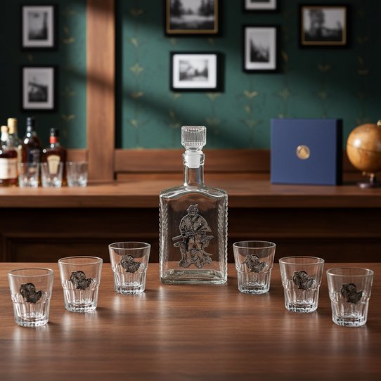 Охота – древнейшая из мужских профессий, как и празднование удачной поимки желаемых трофеев. Поэтому представленный набор для водки «Удачная охота» совмещает в себе сразу обе эти традиции. Ведь глядя на оригинальный декор каждого из составляющих предметов, невольно хочется собраться в ближайшие лесные угодья нашего отечества и проверить свою выдержку, силу и ловкость. А потом сесть вокруг костра вместе с друзьями и обсудить за рюмочкой крепкой самые удачные моменты прошедшей охоты.