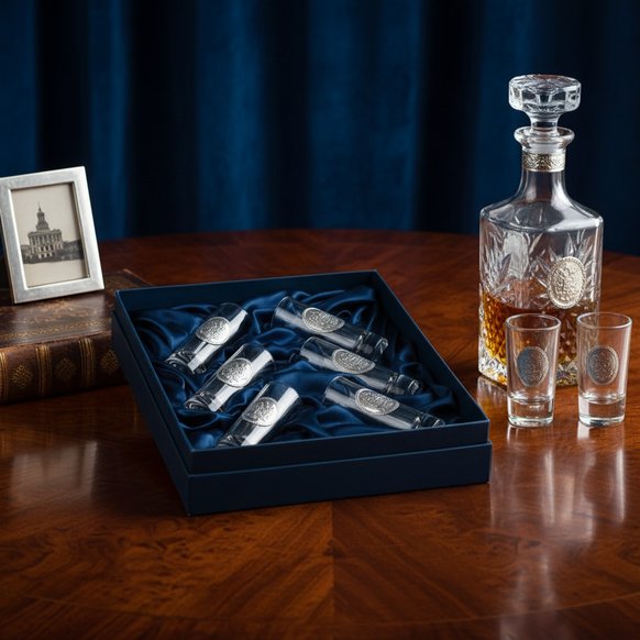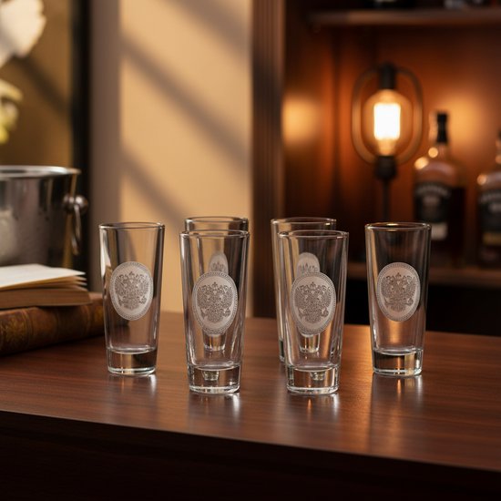 Ансамбль из шести стопок, емкостью 50 миллилитров, закреплен в нишах атласного ложемента и упакован в фирменный короб класса «люкс» из переплетного картона. Изделия имеют всю необходимую маркировку и сертифицированы в соответствии с требованиями законодательства РФ.