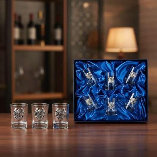 Главной же отличительной чертой стопок являются их металлические барельефы, выполненные мастерами вручную по способу художественного литья. Накладки изготовлены в виде подковы, из-за которой выглядывает морда запряженной лошадки. Каждая деталь в этом декоре отображена с высокой точностью благодаря тому, что накладки изготовлены из особого сплава, на 95% состоящего из олова. А специальное чернение и полировка барельефов стилизовали поверхность под антикварное серебро с характерными затемнениями.