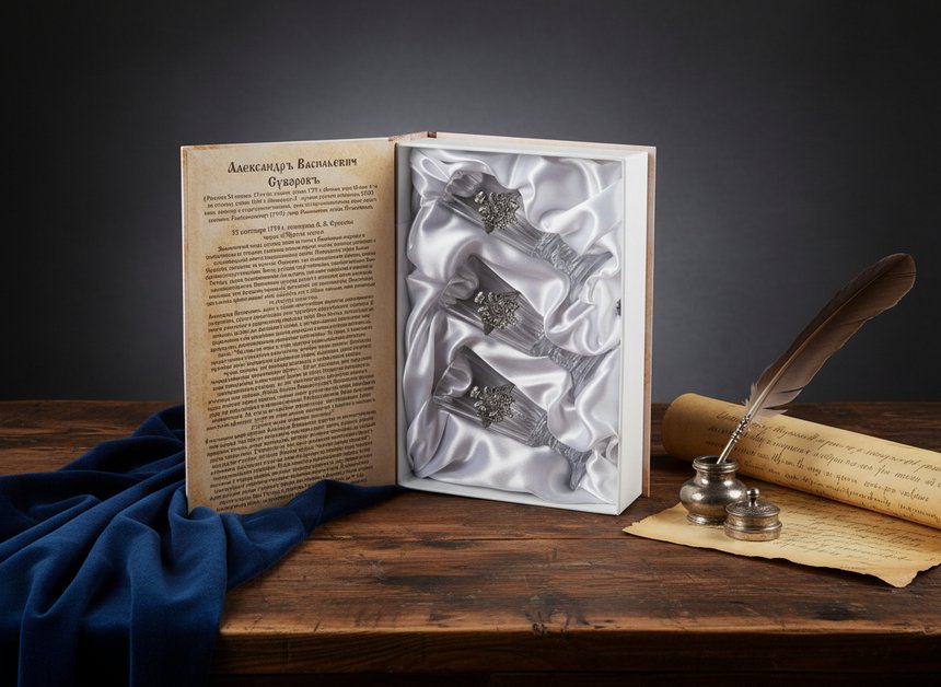 Но на этом приятные сюрпризы не заканчиваются — в качестве подарочного короба выступает книга, стилизованная под оригинал авторства А. В. Суворова «Наука побеждать» из библиотеки для Служебного Пользования. Внутри переплета находится белоснежный ложемент из атласа, в нишах которого прочно закреплены лафитники.