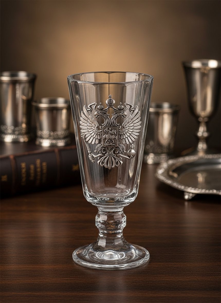 Лафитники выполнены из прозрачного чешского стекла, а их емкость составляет классические 50 мл. Параметры идеальны для водки, поскольку этот спиртной напиток принято пить одним тостом. Каждый из трех лафитников украшен барельефами ручной работы. Они представляют собой государственный герб России в виде двуглавого орла. Символ смотрится торжественно и солидно.