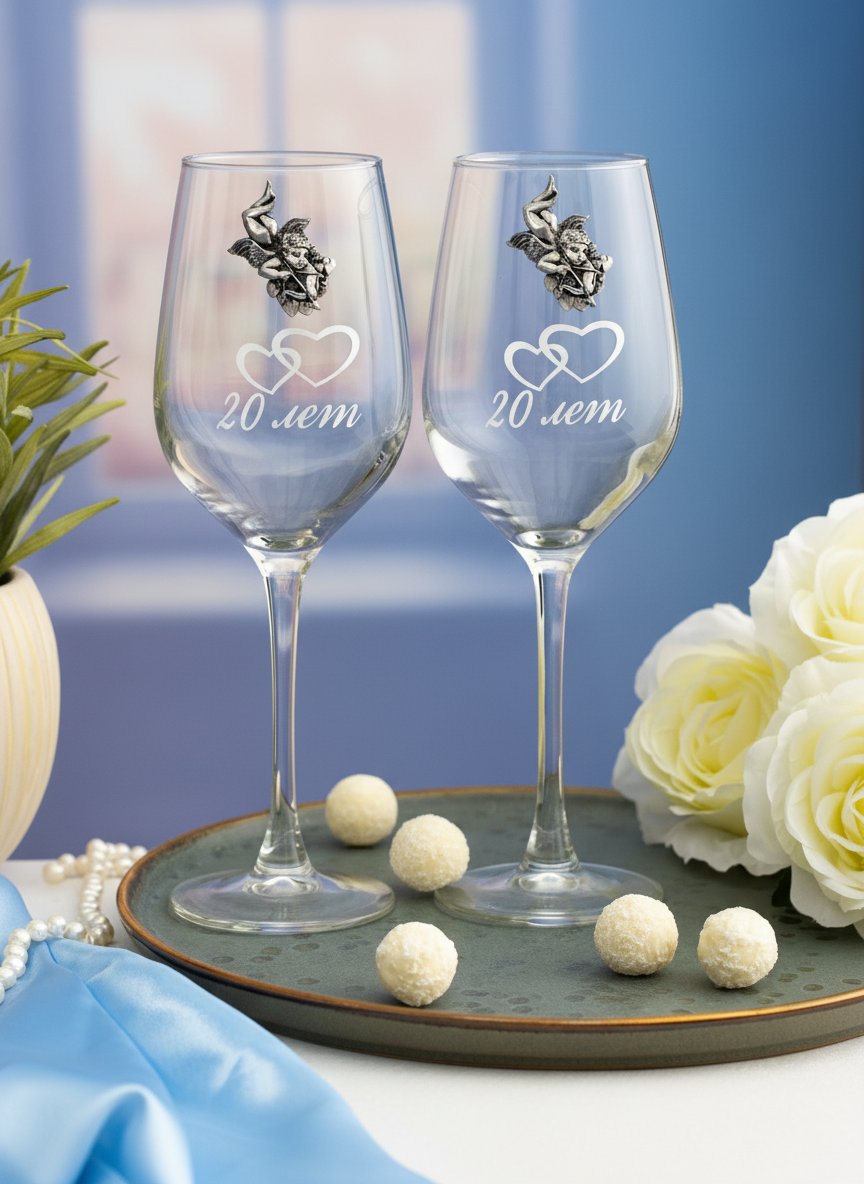 ✓ наборы фужеров для шампанского и бокалов для вина. Одним из интересных вариантов подарка на супружеский юбилей станут парные наборы фужеров или бокалов. Выполненные из хрустального стекла, оформленные в невероятно эффектной манере, они сразу притягивают взгляды. Взгляните, насколько стильно смотрятся такие бокалы, как оригинально они задекорированы – здесь и позолота, и барельефы под черненое серебро, и эксклюзивные украшения. Все наборы выполнены в романтической стилистике и предлагаются в красивых подарочных коробках. А ведь вы можете выбрать даже комплект с именной гравировкой – с именами юбиляров или со своим поздравлением!