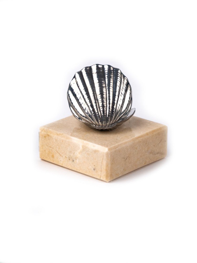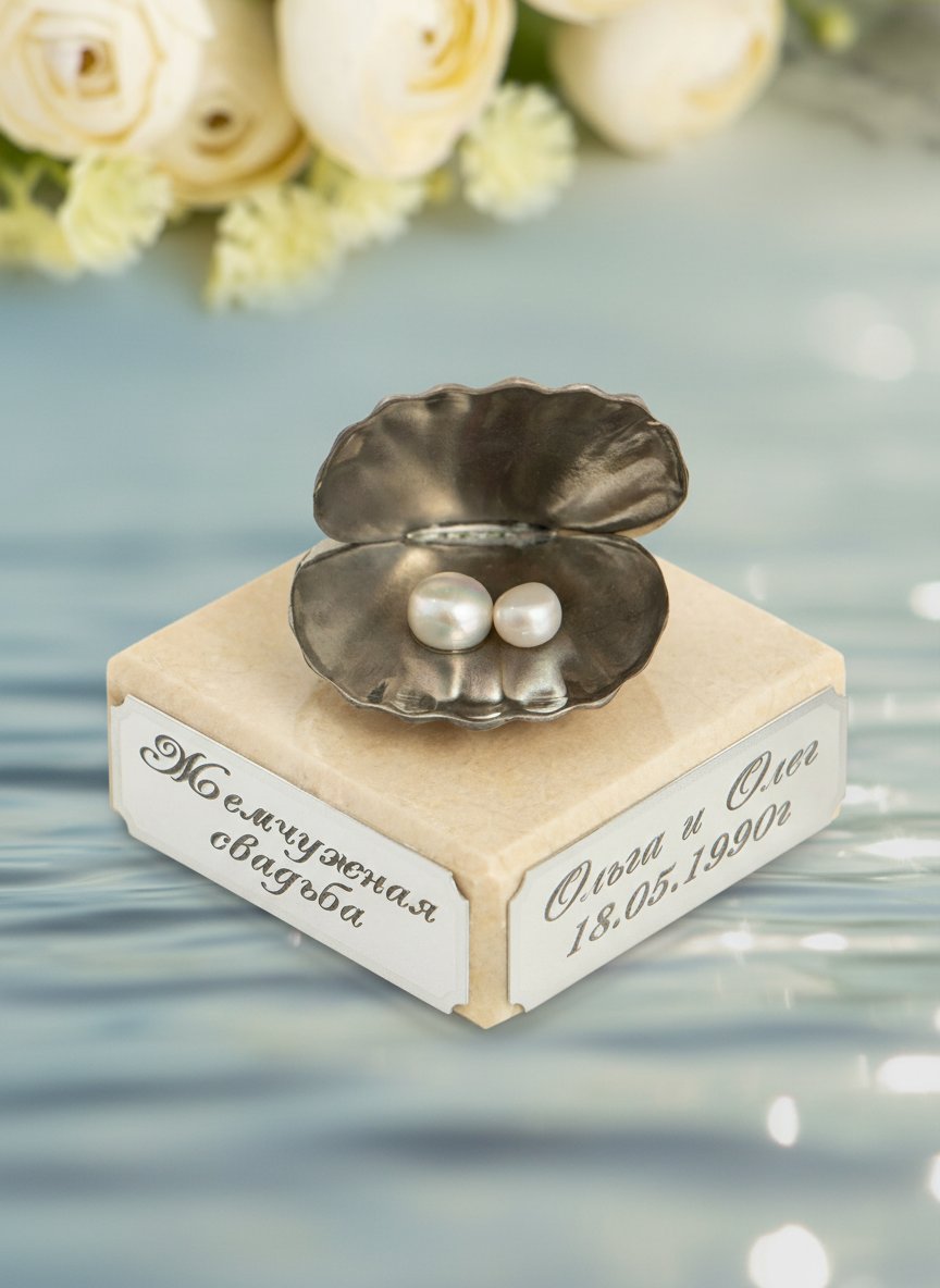 Фигурка «Жемчужная свадьба» создана руками талантливых мастеров методом точного художественного литья. Этот памятный сувенир выполнен в виде ракушки, внутри которой находятся две жемчужины. Основой для композиции послужил пьютер – специальный металлический сплав, содержащий 95 процентов олова. Поверхность металла облагорожена полировкой и чернением, придающим ей вид антикварного серебра. Декоративная ракушка надежно закреплена на подставке, вырезанной из натурального природного камня.