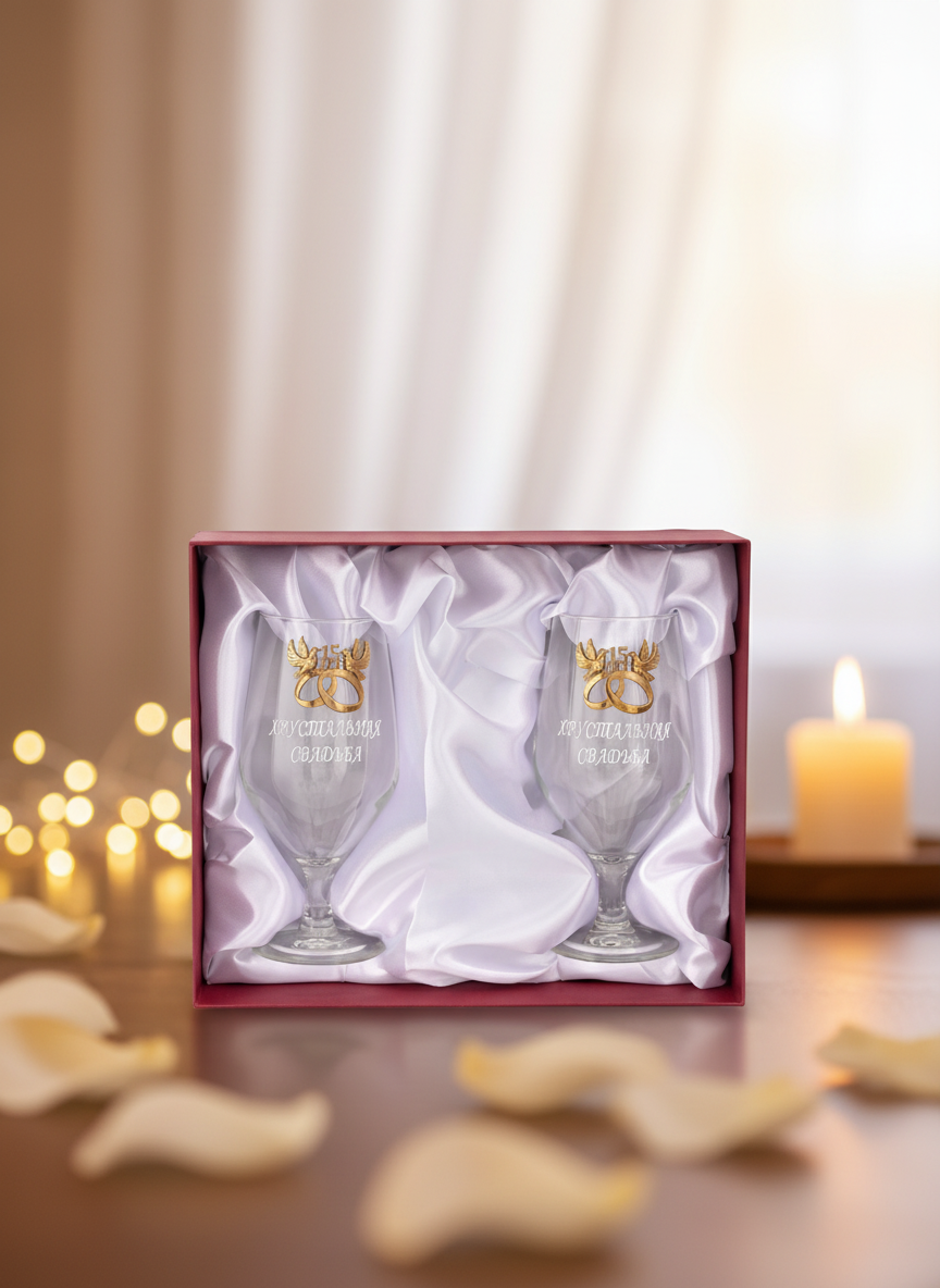 Если вы перевяжете уникальный набор яркой цветной лентой и приложите к нему соответствующую поздравительную открытку с душевным текстом, то получите идеальный презент на хрустальную свадьбу.