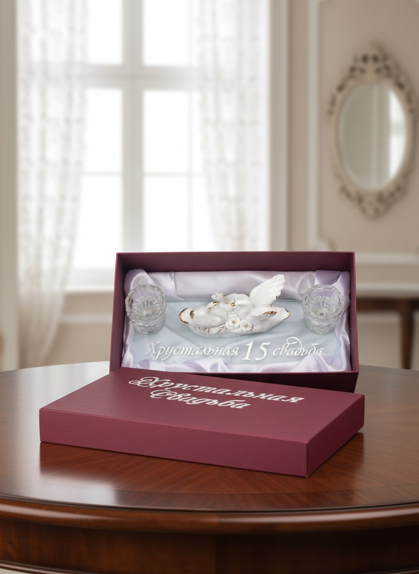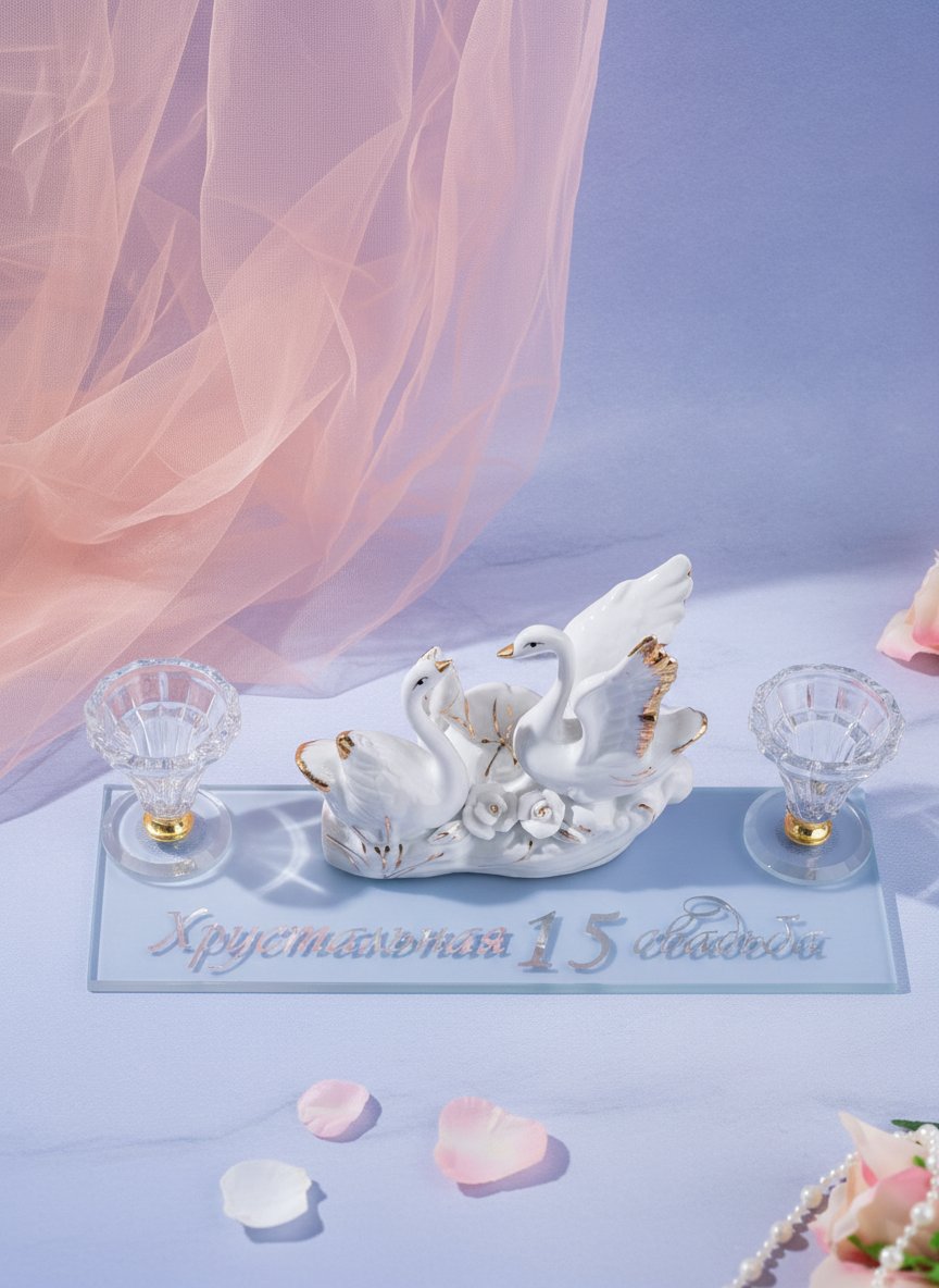 Центральное место в композиции отведено паре белых лебедей, танцующих на воде в окружении кувшинок. Края оперения птиц окрашены контрастным золотым напылением. По переднему краю основания изящным фигурным шрифтом нанесена надпись «Хрустальная 15 свадьба». Она идеально завершает эстетику полностью сформировавшегося романтического образа.