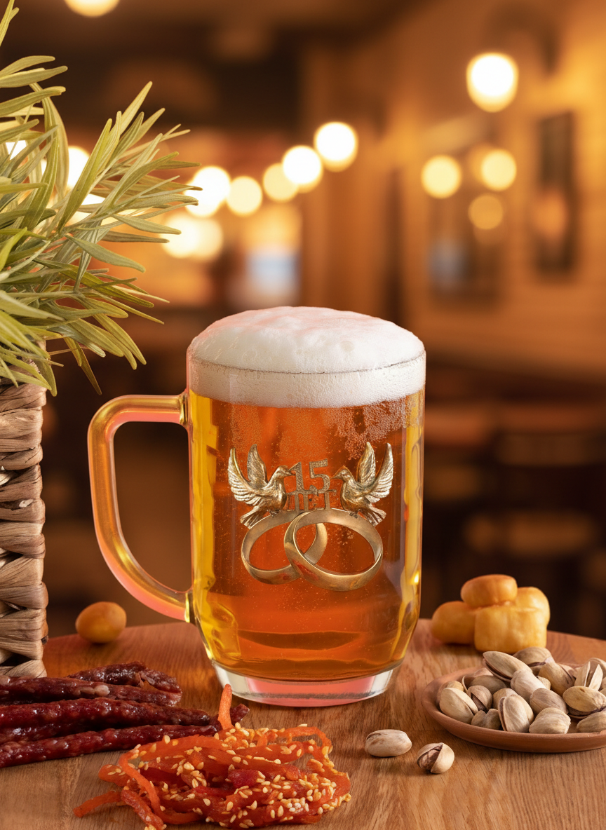Дражайшие половинки часто поругивают мужей за пристрастие к веселящему душу пенному эликсиру. Однако если на застольной емкости для этого напитка будет сиять особым светом напоминание о важном семейном празднике, желание высказывать критику в адрес мужа исчезнет у жены само собой. Ведь пиво, выпитое в память о Хрустальной свадьбе, лишь укрепляет нежные чувства и единство двух сердец!