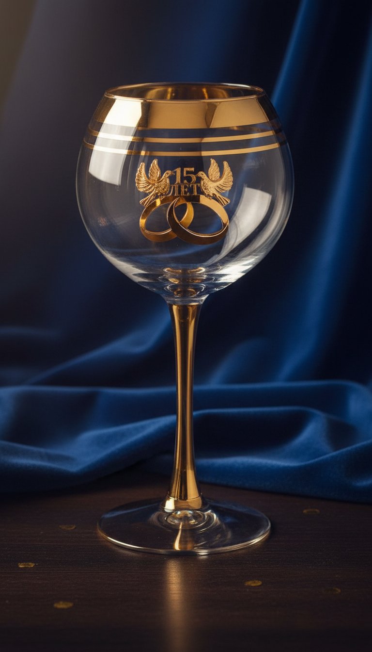 На каждом из бокалов можно увидеть бронзовые барельефы с двумя кольцами и парой голубей, несущих надпись «15 лет счастья». Символичен и выбор изображения для барельефа, ведь голуби ассоциируются с чистотой и верностью, а кольца во все времена означали крепкий и долгий союз двух любящих сердец.