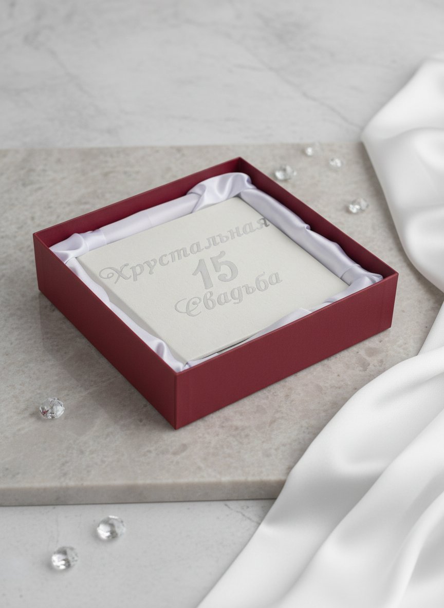 Подарочная упаковка для фотоальбома — дизайнерская находка, не требующая дополнительного декорирования для вручения. Она представляет собой фирменную коробку из переплётного картона с имитлином и шёлковым ложементом внутри. Супруги будут в полном восторге, когда, открыв коробку, они увидят не только потрясающий фотоальбом, но и яркую надпись на верхней крышке «Хрустальная свадьба».