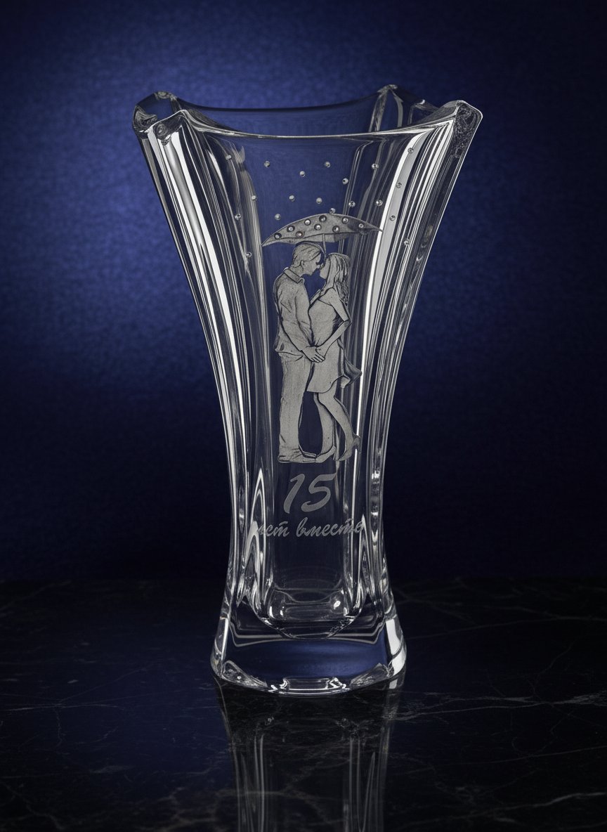 Стеклянная ваза «15 лет вместе» произведет сильное впечатление и на виновников торжества, и на всех без исключения гостей их семейного праздника. Она отлита умелыми руками талантливых стеклодувов из идеально прозрачного экологически чистого стекла. Необычная форма этого сосуда напоминает собой бутон распустившегося цветка, а ее утолщенное донышко способствует понижению центра тяжести предмета и его высокой устойчивости при случайных касаниях.