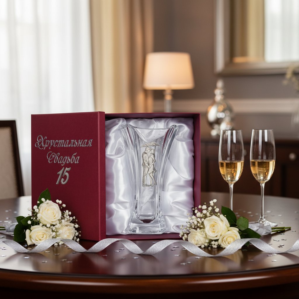 Для безопасной транспортировки и переноски вазы предусмотрена специальная коробка из переплетенного картона, облагороженного имитлином. Коробка представляет собой идеальную праздничную упаковку. На ее крышке имеется надпись «Хрустальная Свадьба 15», выведенная изящным серебряным шрифтом. Внутри коробки люкс-класса находится мягкий бархатный ложемент. Вам останется лишь перетянуть презент красивой лентой с пышным бантом и сопроводить его при вручении добрыми пожеланиями.