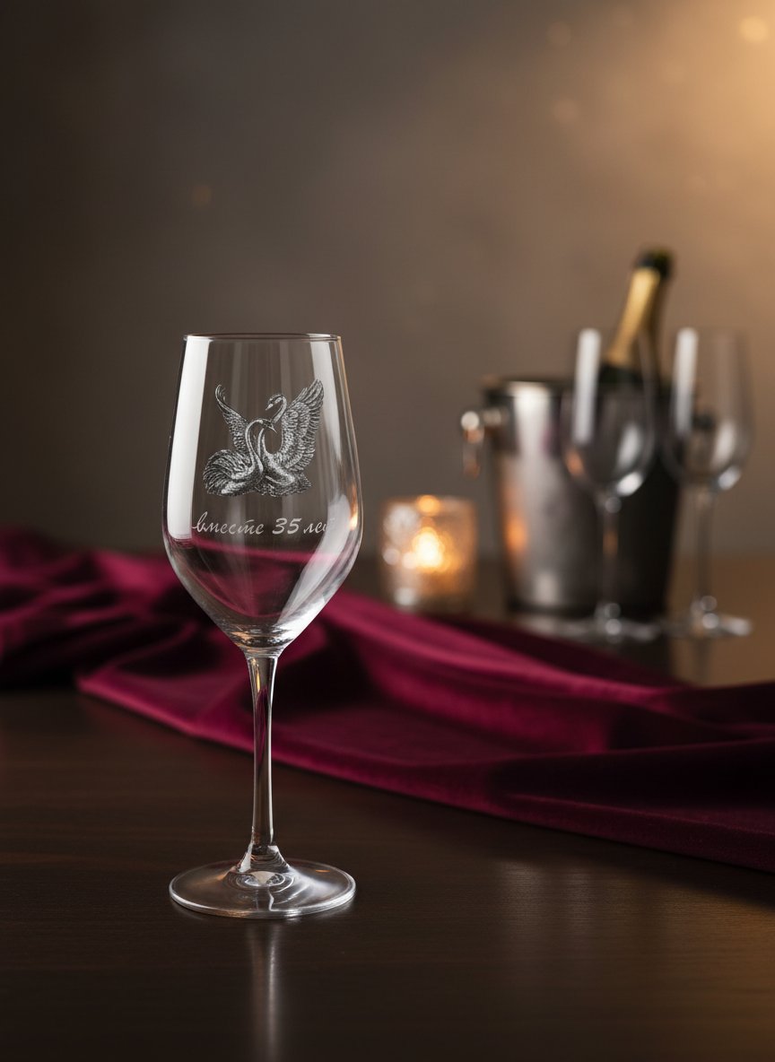 Супруги подошли к важному юбилею совместной жизни — коралловой свадьбе. О том, что пройден путь в 35 лет подскажет механическая гравировка на бокалах, которая сделана настолько качественно, что она неподвластна времени. Главными украшениями фужеров стали металлические барельефы в виде танцующих лебедей. Эти птицы — символы верности, преданности, любви, а потому дизайнеры решили использовать их образы в качестве декора. Накладки изготовлены из сплава «пьютер», который на 95% состоит из олова, а сделаны они с помощью художественного литья, да настолько точно, что подобны ювелирным украшениям.