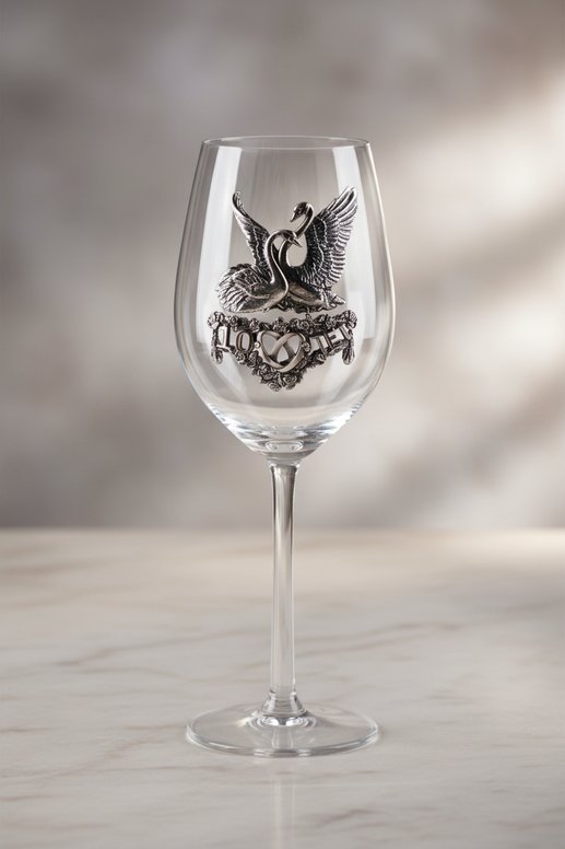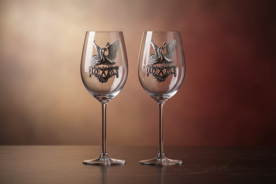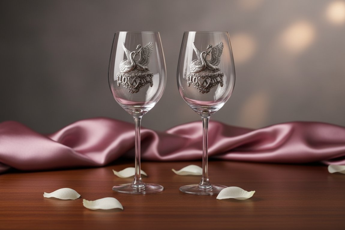 Впечатление от внешнего вида праздничных аксессуаров значительно усиливает барельеф, отлитый из специального сплава олова – пьютера и надежно закрепленный на передней стороне чаш. В его рисунке идеально соединились два свадебных колечка, пара лебедей и надпись «10 лет» в обрамлении изящного рельефного орнамента. Профессиональная обработка особым чернением и полированием превращает металл барельефа в антикварное серебро.