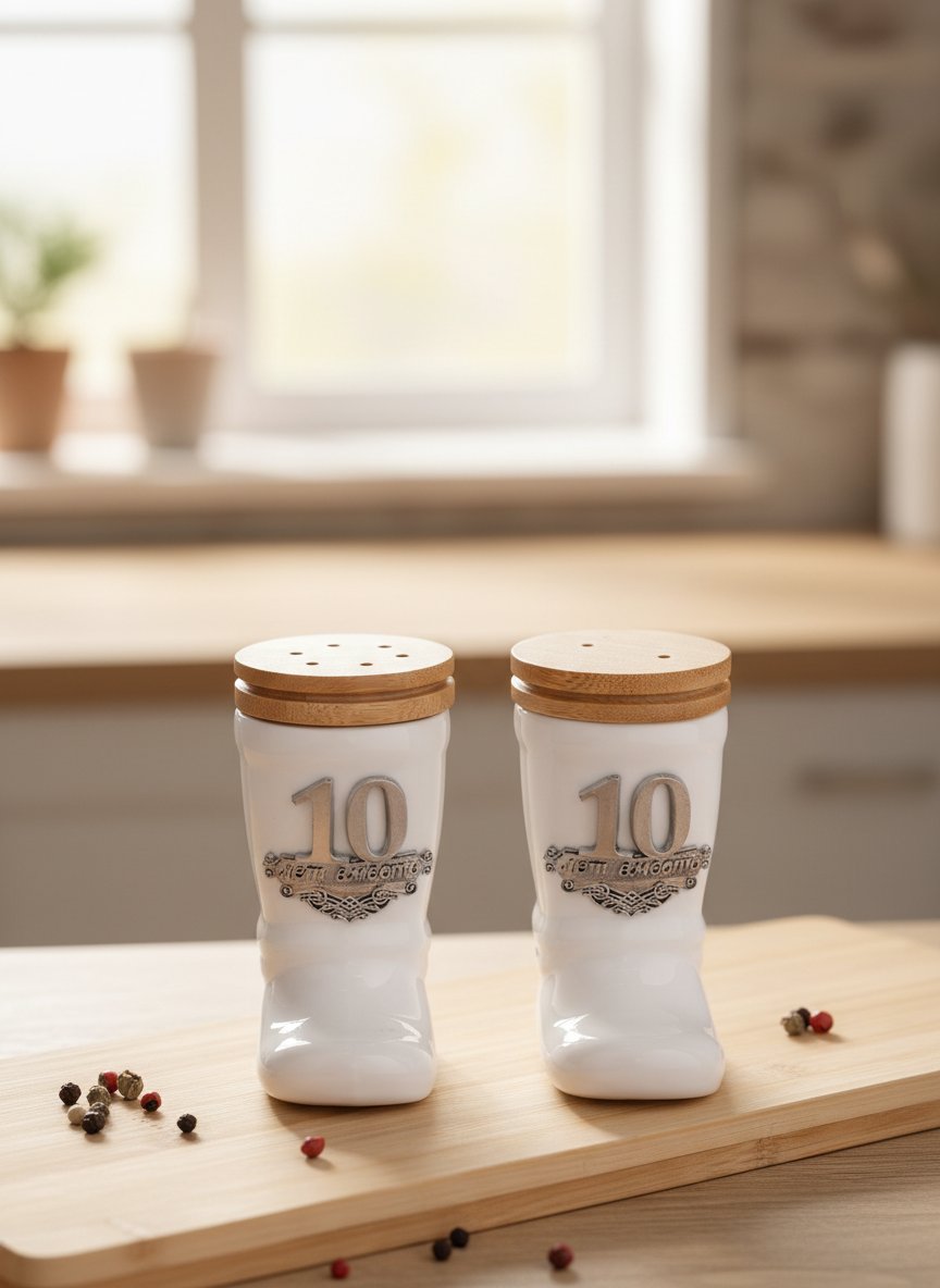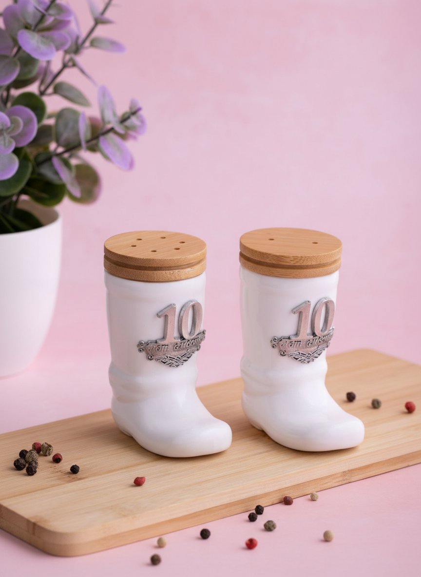 Набор для специй «Два сапога пара» – это тот самый презент, который гарантированно привлечет к себе взгляды гостей юбилейного застолья и непременно вызовет улыбки у получателей данного эксклюзивного дара. Набор состоит из двух необычных емкостей для перца и соли, выполненных в виде забавных сапожков.