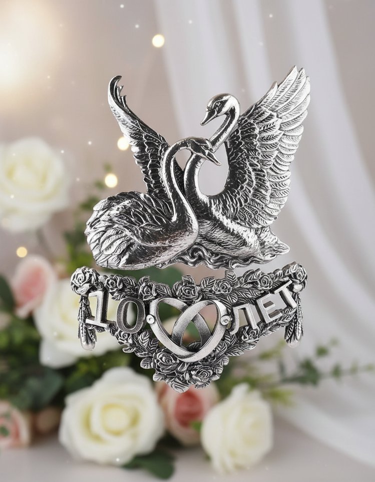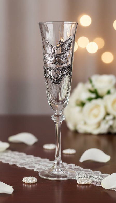 По ее задумке металлические накладки бокалов изготовлены из оловянного сплава, состоящего не менее чем из 95% материала. А какой повод еще называется Оловянной Свадьбой? Конечно, тот же, что и розовый Юбилей женитьбы! Барельеф стилизован под антикварное серебро благодаря специальному затемнению и последующей полировке. Накладки выполнены в виде пары лебедей, восседающих на сплетении роз, внутри которых нанесена Юбилейная дата.