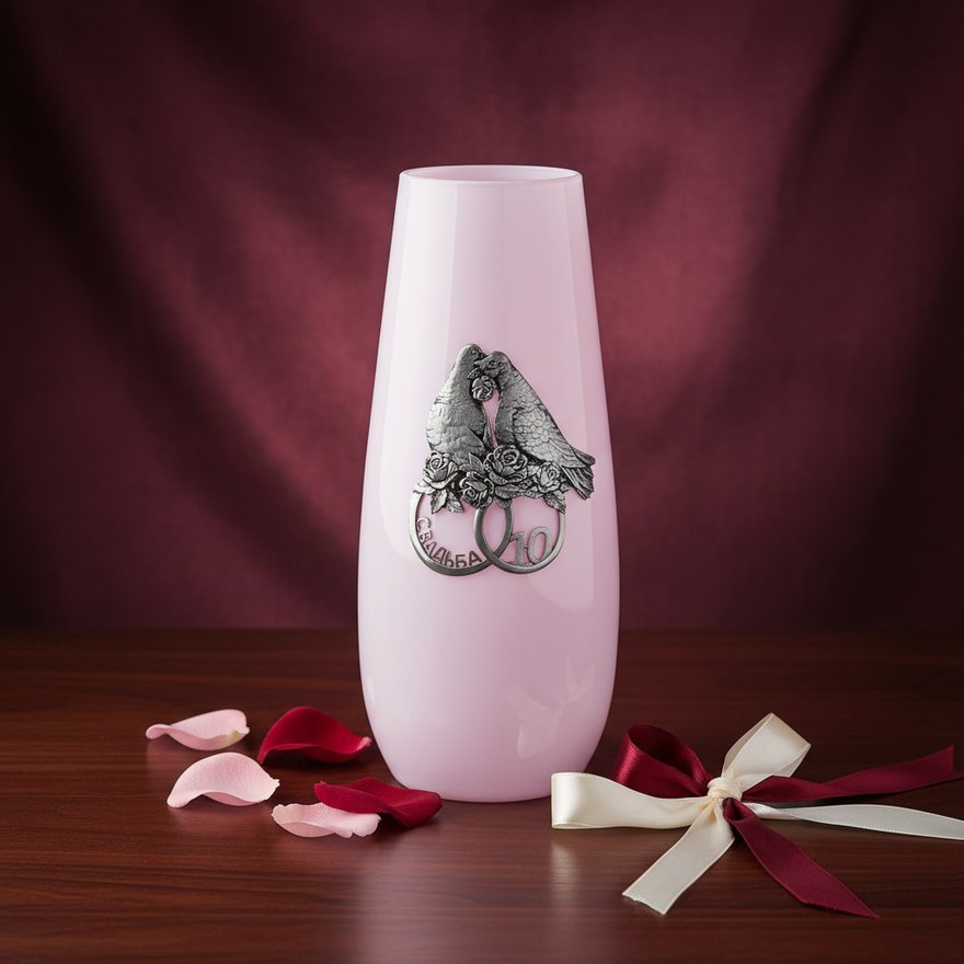 Поскольку так сложилось, что 10 лет свадьбы символично называют оловянной, то и декор для вазы дизайнеры решили сделать из специального металлического сплава «пьютер», с присутствием олова не менее 95%. Пластичное, мягкое олово напомнит супругам о том, что нужно быть гибкими в отношениях, а прочность металла говорит о крепости их союза. Барельеф с романтичными голубками и обручальными кольцами выполнен техникой «художественное литьё», а после дополнительного чернения накладка приобрела эффект антикварного серебра. Милое декоративное оформление не оставит равнодушными супругов и подарит воспоминания о самом сладком в их жизни медовом месяце.