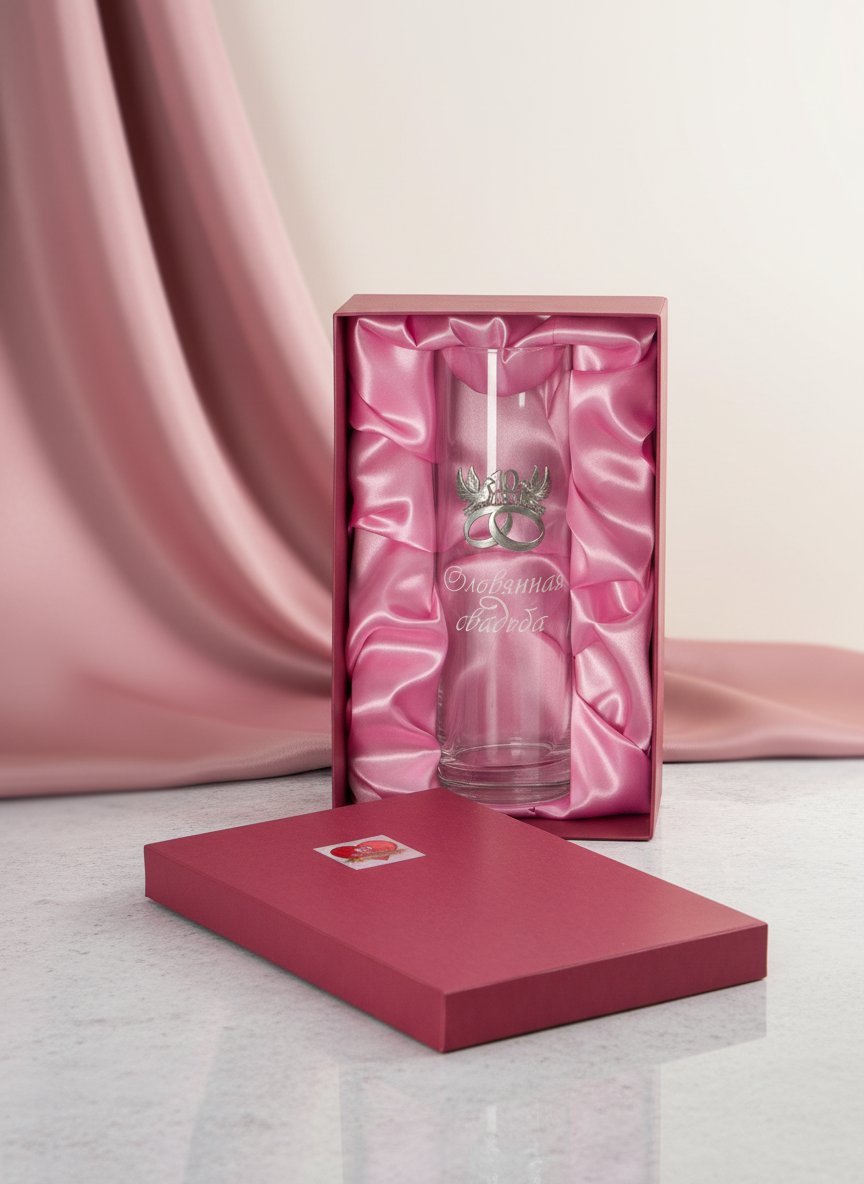Стеклянная ваза «10 лет счастья» — роскошный подарок, с которым жизнь супругов станет ярче, ведь теперь будет ещё один повод, чтобы в доме всегда были потрясающие букеты.