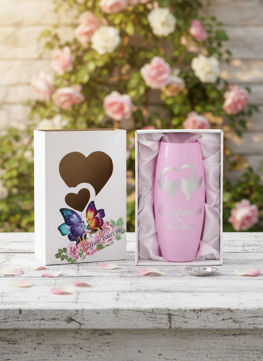 Стеклянная ваза «10 лет вместе» отлита руками талантливых мастеров из исходного материала идеальной экологической чистоты. Финальная термообработка задала повышенную прочность стеклу, воплотившемуся в классическую форму. А мягкое окрашивание в розовый цвет подчеркнуло романтические мотивы аксессуара. Высота интерьерного аксессуара составляет 255 миллиметров при максимальном диаметре 80 мм.