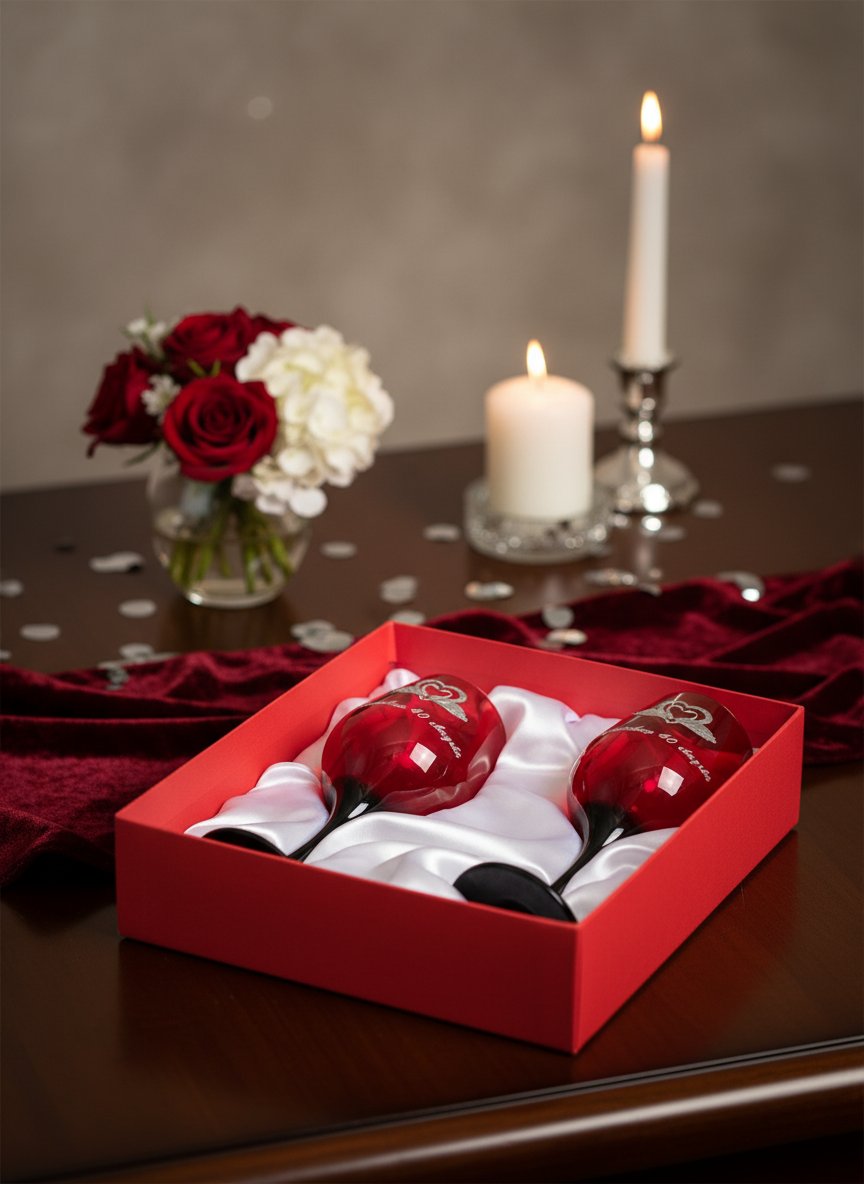 Набор бокалов для вина «Рубиновая свадьба» состоит из двух уникальных застольных сосудов, каждый из которых способен вместить по 365 миллилитров веселящего душу и сердце эликсира. Они изготовлены из стекла высокой экологической чистоты и не имеют никаких посторонних вкраплений. Дополнительный визуальный эффект формируется благодаря цветовому окрасу стекла с переходом от насыщенного красного оттенка чаши к почти черному цвету основания.