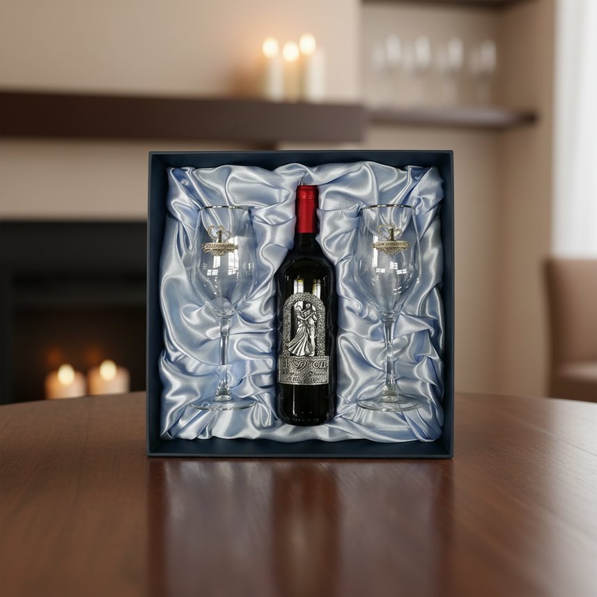 Каждый бокал украшен нарядными барельефами ручной работы. Они выполнены из сплава пьютер, в котором содержание олова достигает примерно 95 процентов. На барельефах изображена надпись «1 год вместе» в окружении сердец и витиеватых узоров. Ретро-эффект накладок обусловлен использованием метода художественного литья, чернения с имитацией серебра с последующим применением полировки. Дополнительно края бокалов украшены каемкой из платины.