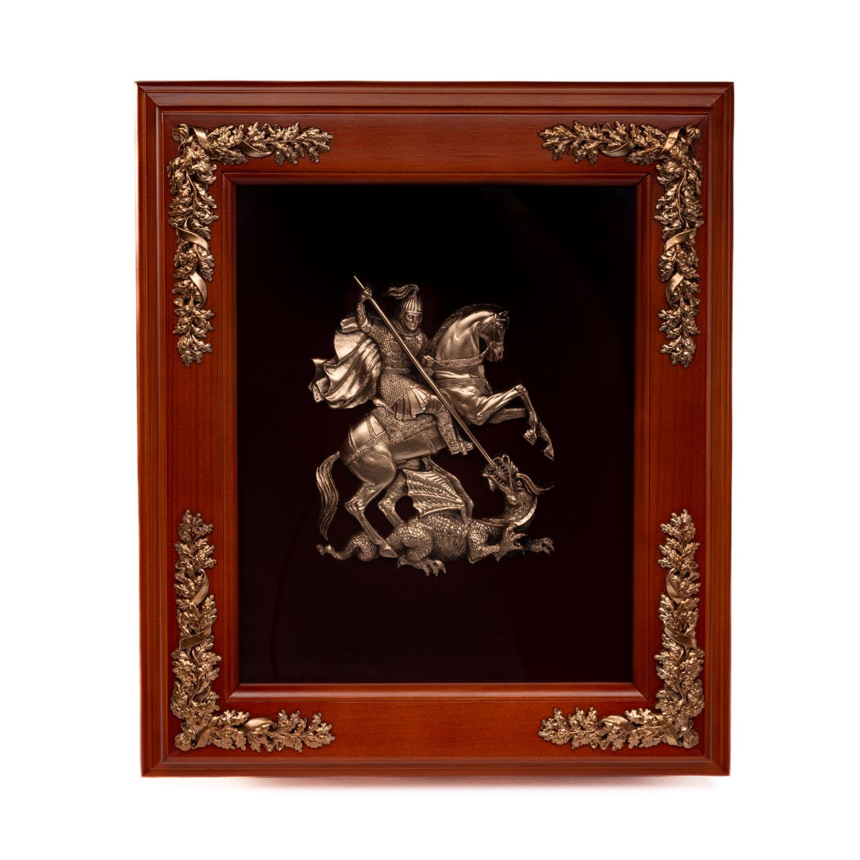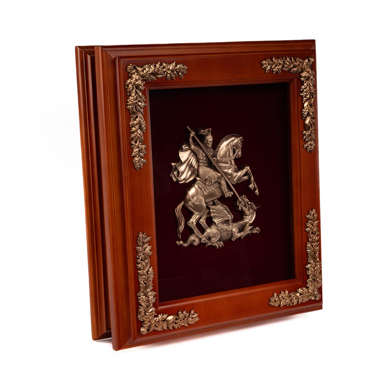 Центральным украшением крышки интерьерного аксессуара служит декоративная рельефная фигура всадника в броне, поражающего копьем змея. Это исторический герб Москвы. Барельеф изготовлен из меди высокотехнологичным способом точной художественной отливки под давлением и закрыт от попадания пыли стеклом. Углы крышки облагорожены медными декоративными уголками, отлитыми в форме эффектного растительного орнамента.