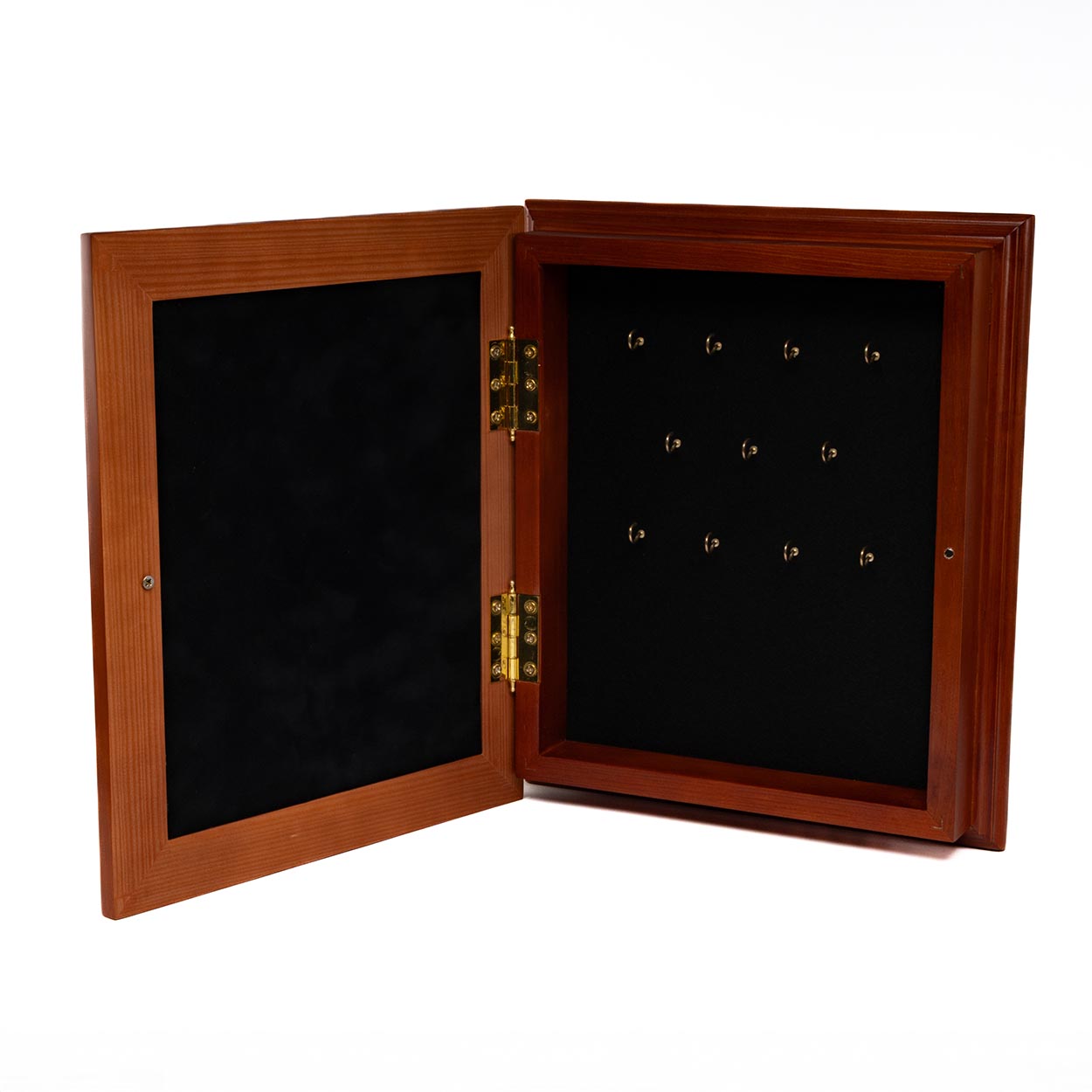 Внутреннее пространство ключницы отделано слоем мягкого бархата. На его фоне удобно разместились в три ряда одиннадцать крючков для хранения ключевых связок, брелоков или отдельных ключей. На задней стенке подарочного аксессуара предусмотрены соответствующие настенные крепления.