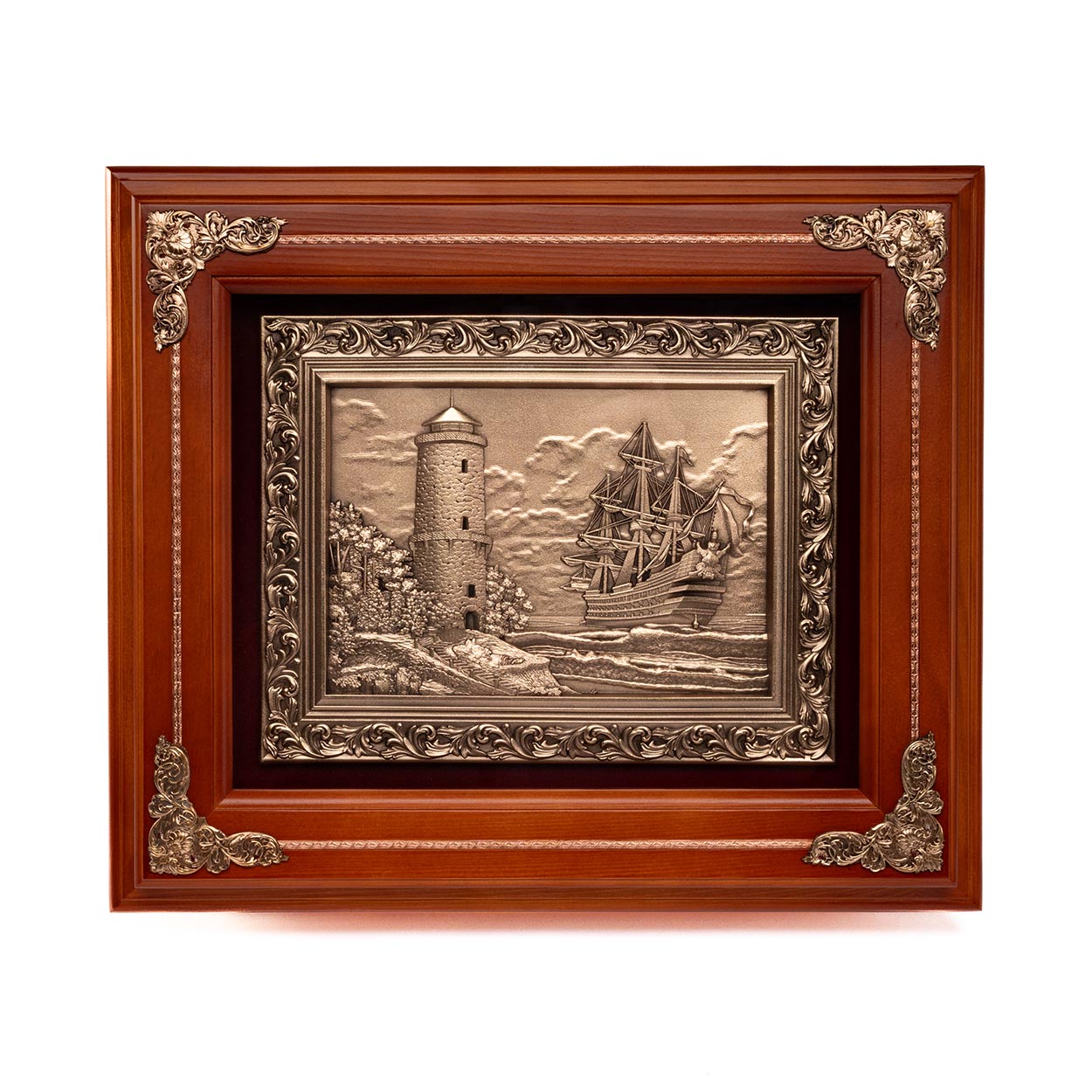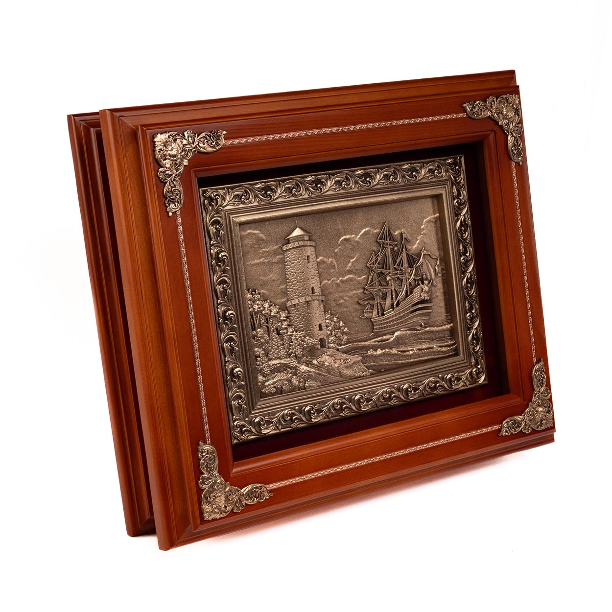Деревянная настенная ключница «Маяк» выполнена методом гальванопластики. Однако на деле представляет собой весьма функциональную вещь – ящичек для хранения ключей. Внутри ключницы одиннадцать крючков, отделка бархат, магнит на крышке, крышка крепится к основанию при помощи двух латунных петель, на задней стороне подвесы для крепления на стену. Корпус ключницы изготовлен из натурального дерева дуб с различными цветами тонировки.
