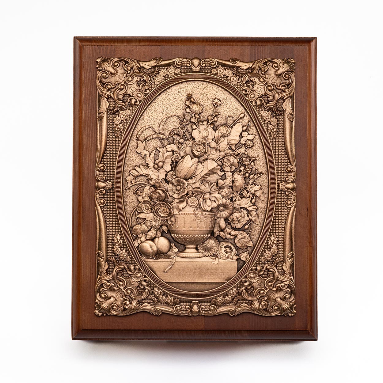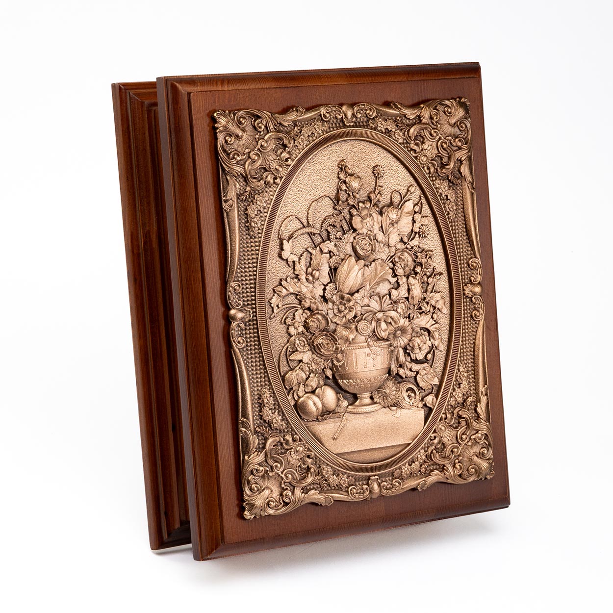 Отдельного внимания заслуживает панно, которым украшена лицевая часть настенной ключницы «Цветы в вазе». Элегантная композиция сделана из меди при помощи метода гальванопластики. Знатоки оценят такой метод изготовления панно, ведь его суть заключается в тончайшем покрытии начальной формы слоем определенного металла. Это придает предмету особую выразительность, а деталям – ювелирную точность. Смеем вас заверить, что рассматривать элементы панно захочется беспрестанно: каждая часть натюрморта с вазой, фруктами и цветами проработана очень досконально.