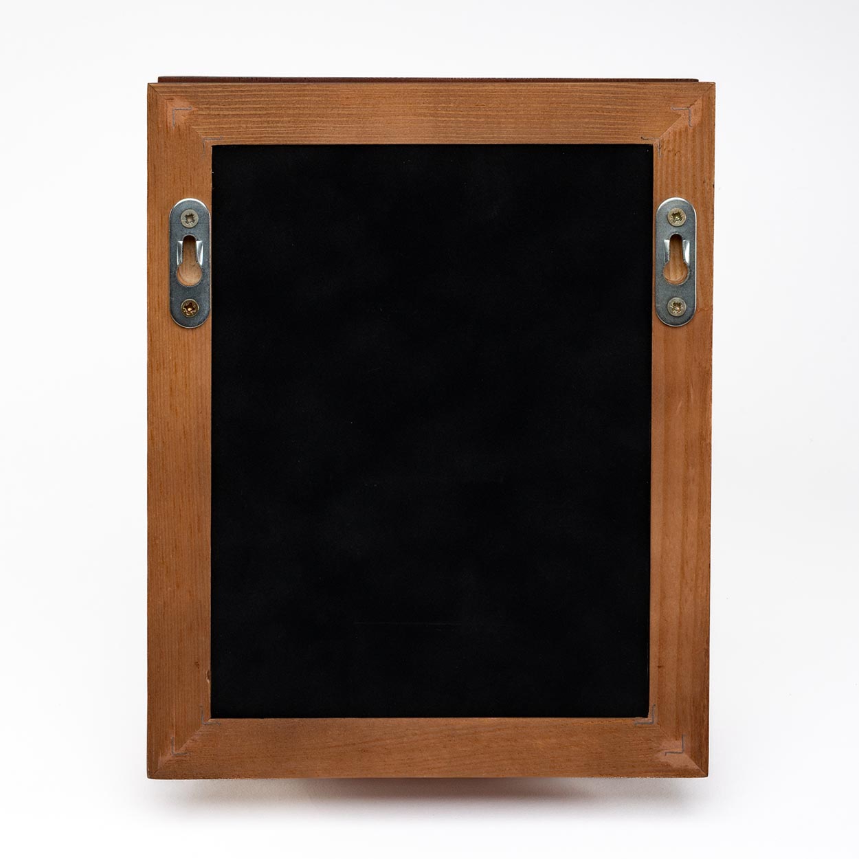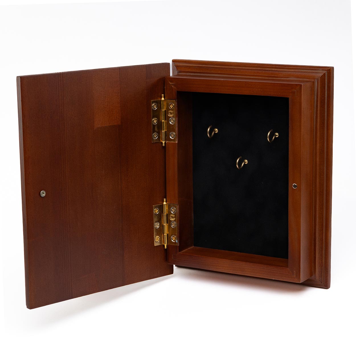 Изысканная ключница сделана из натурального дерева, как и положено дорогой и качественной вещи. Разновидность дерева, а это дуб, был выбран как олицетворение и воплощение прочности, долговечности в прямом и переносном смысле. Для обретения эффектного вида дубовая основа прошла процесс тонировки.