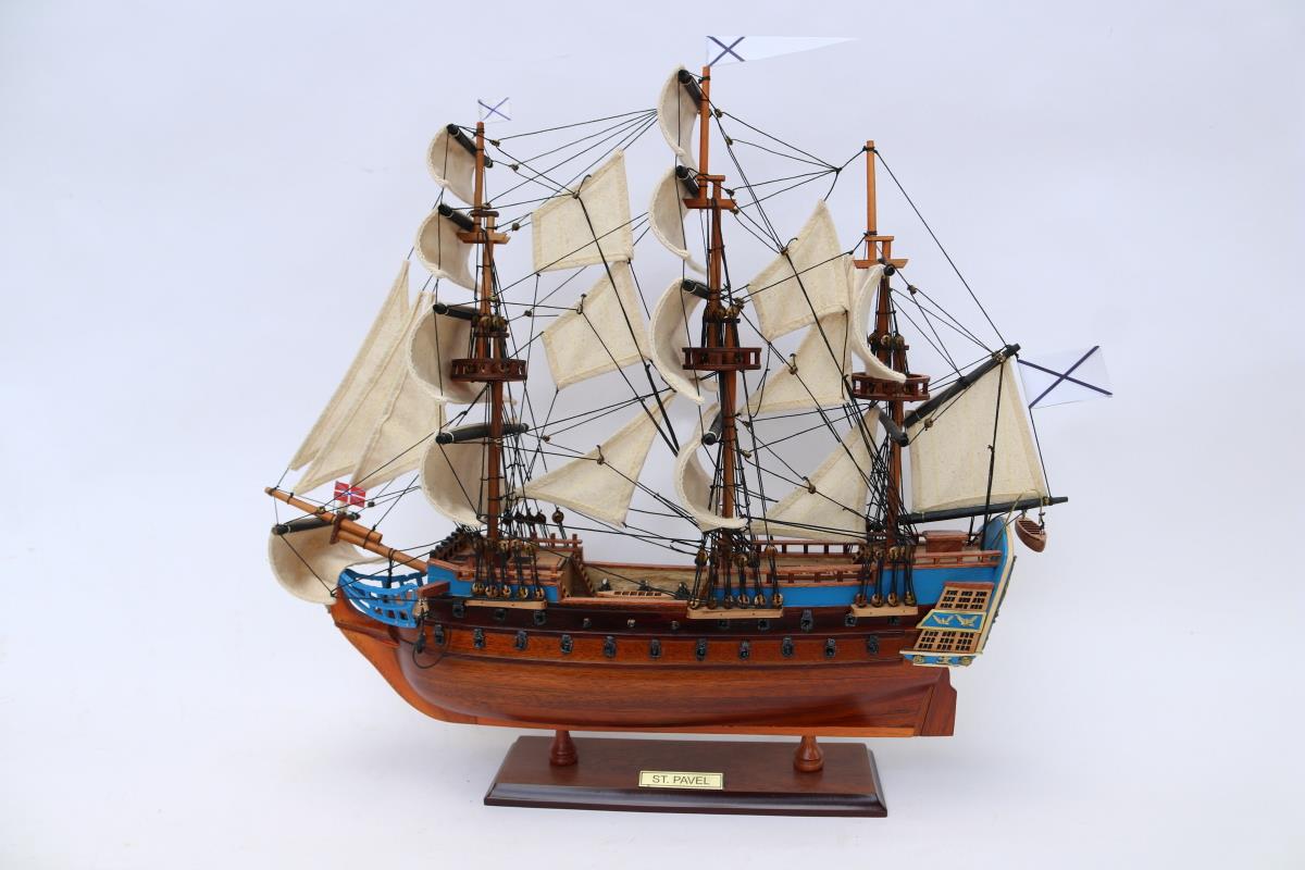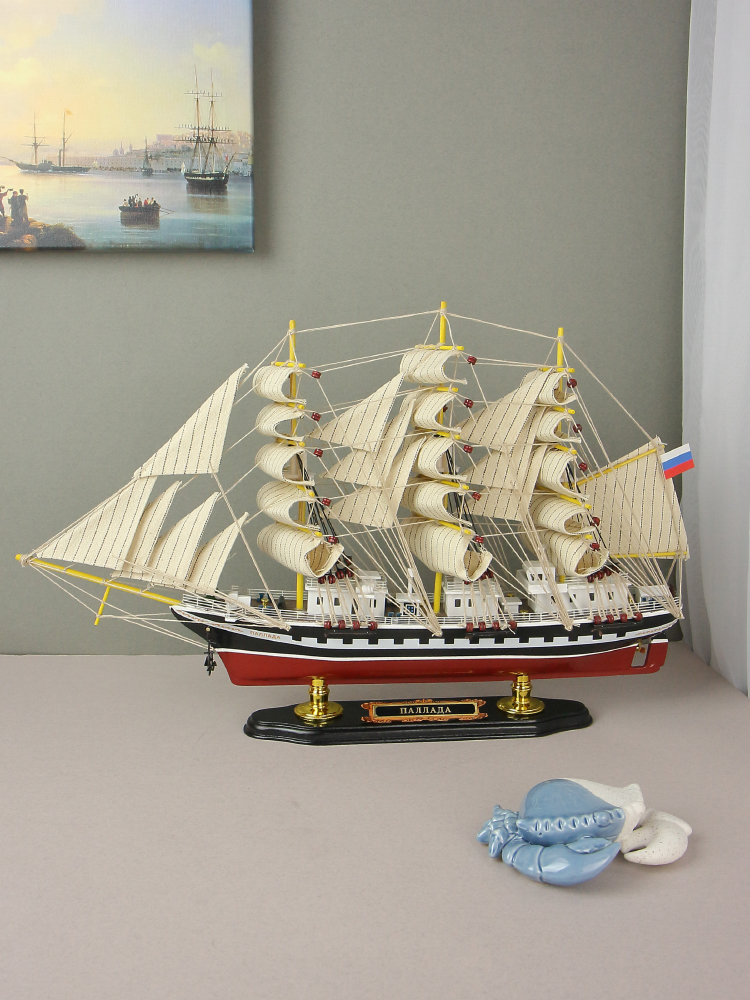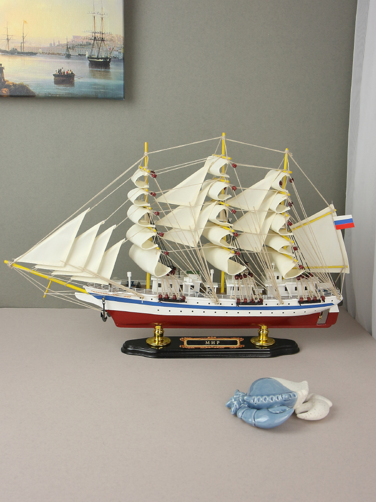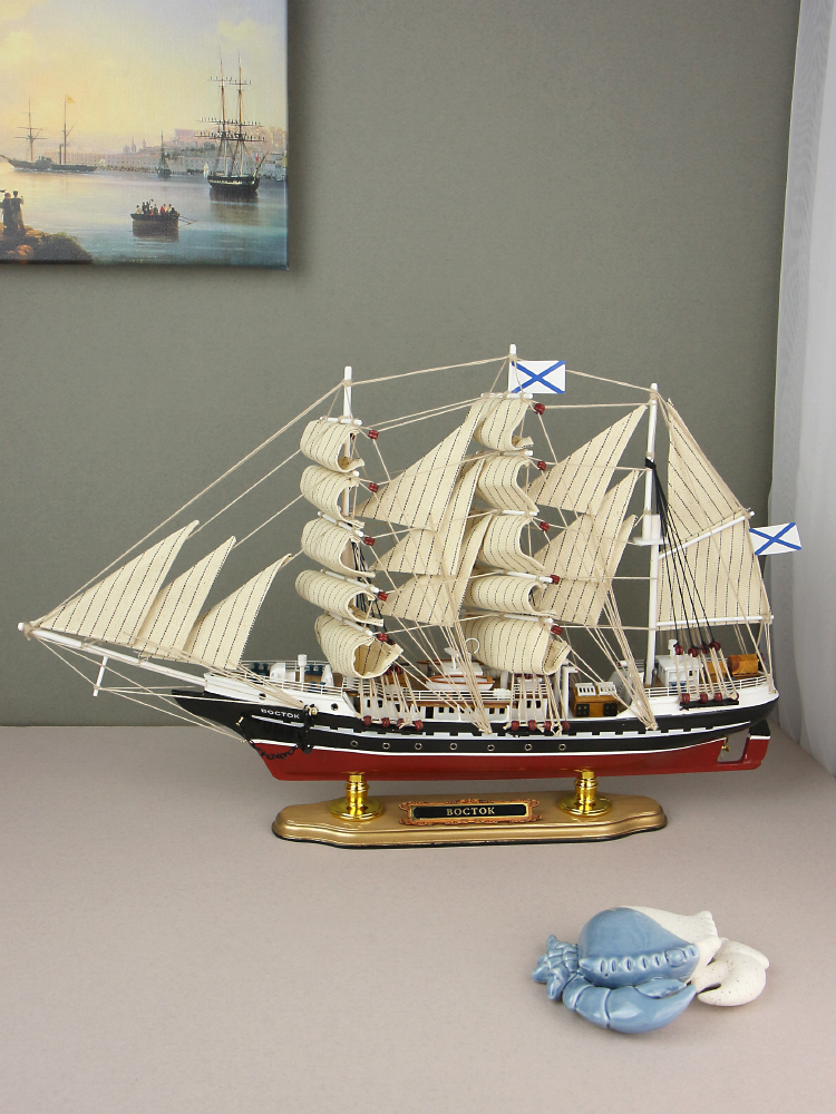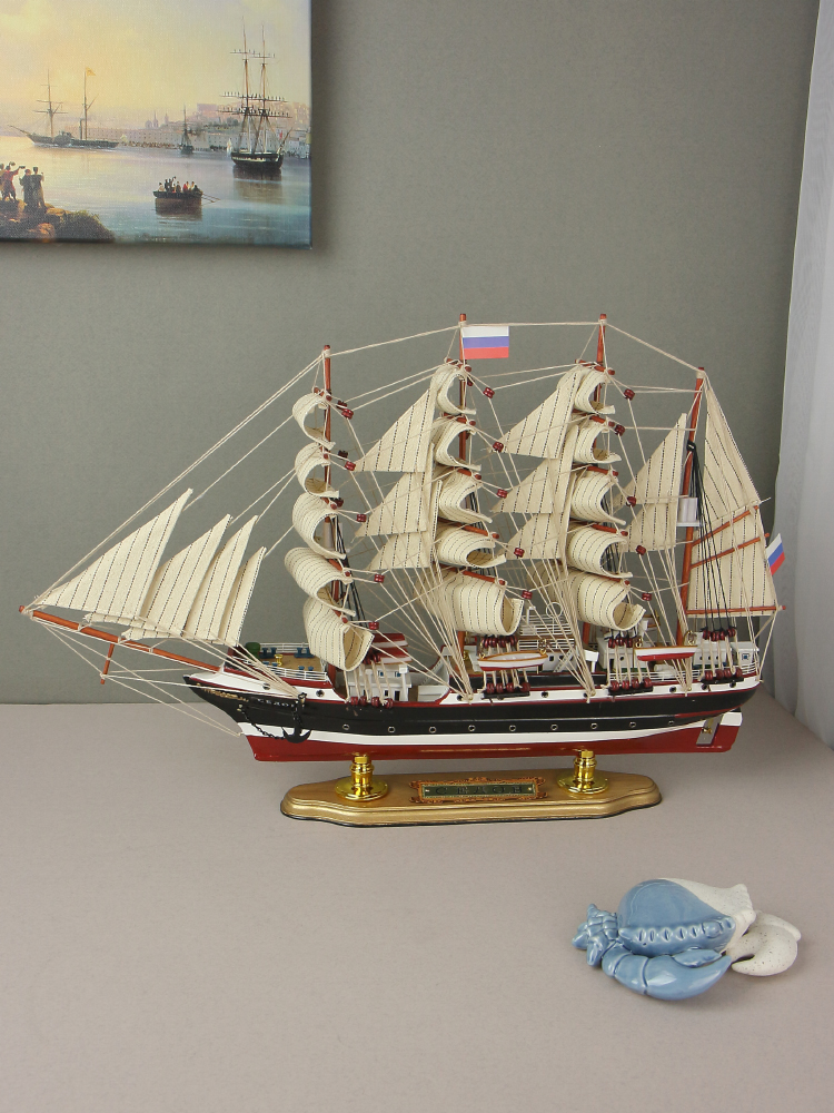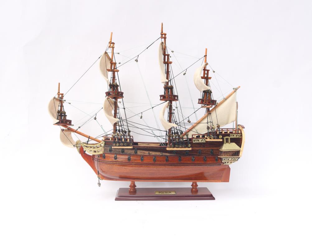 ✓ малые корабли – как уже отмечалось, к этой группе относятся парусные суда, высота которых варьируется в диапазоне от 24 до 32 см. Их скромные размеры вовсе не обозначают отсутствие детализации. Так, к примеру, модель «Севастополь» – масштабная уменьшенная копия своего реального прототипа – краснознамённого линейного корабля, который верно нёс службу сначала во славу русского, а затем советского флота. На его долю пришлись участие в Гражданской войне, Кронштадском мятеже, в Великой отечественной войне. Для изготовления корпуса, мачт сувенирной копии использована натуральная сосна, а паруса сшиты из хлопкового полотна. Славное военное прошлое есть и у прототипа ещё одной нашей модели – бронепалубного крейсера Российского императорского флота «Боярин», героически погибшего в годы Русско-японской войны. Помимо упомянутых обсуждаемая категория нашей сувенирной «флотилии» представлена моделями «Возмездие» (копия легендарного одноимённого пиратского парусника), «Цезарь», «Императрица Мария», «Святой Георгий» и пр.;