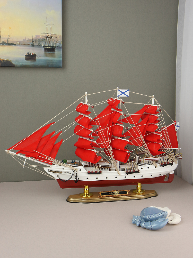 ✓ средние корабли – к этой группе отнесены модели высотой от 32 до 45 см. Начать их обзор хочется с сувенирного корабля «Scarlet» – масштабной копии одноимённого реально существовавшего парусника, в оснащении которой присутствуют все необходимые элементы оснастки, что делает модель необыкновенно реалистичной и очень декоративной, идеально подходящей для воссоздания аутентичной морской атмосферы. К этой же категории относится масштабная копия трёхмачтовика – баркалона (парусно-гребного судна) «Меркурий», построенного по приказу Петра I на воронежских верфях. Это трёхмачтовое судно принимало участие в Керченском походе, результатом которого стало взятие Россией контроля над акваторией Азовского моря. Особого упоминания заслуживает ещё одна модель – сувенирный корабль «Алые паруса», благодаря ярко-рубиновому цвету парусной оснастки он обладает повышенной декоративностью, радующей глаз и украшающей любой интерьер. И потом, на наш взгляд, это, пожалуй, единственная модель в нашей коллекции, которую можно преподнести в дар барышне с романтическим складом личности, поджидающей своего «капитана Грэя», точно знающего, что «чудеса нужно делать своими руками»;
