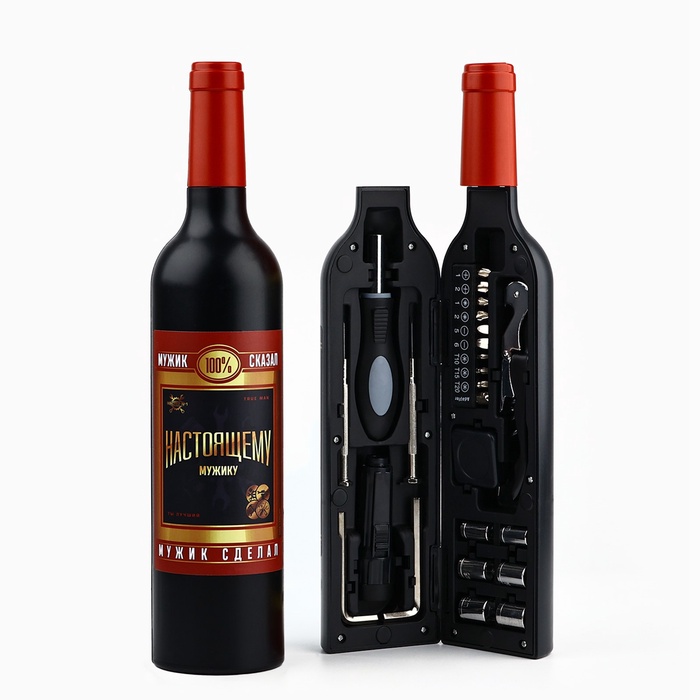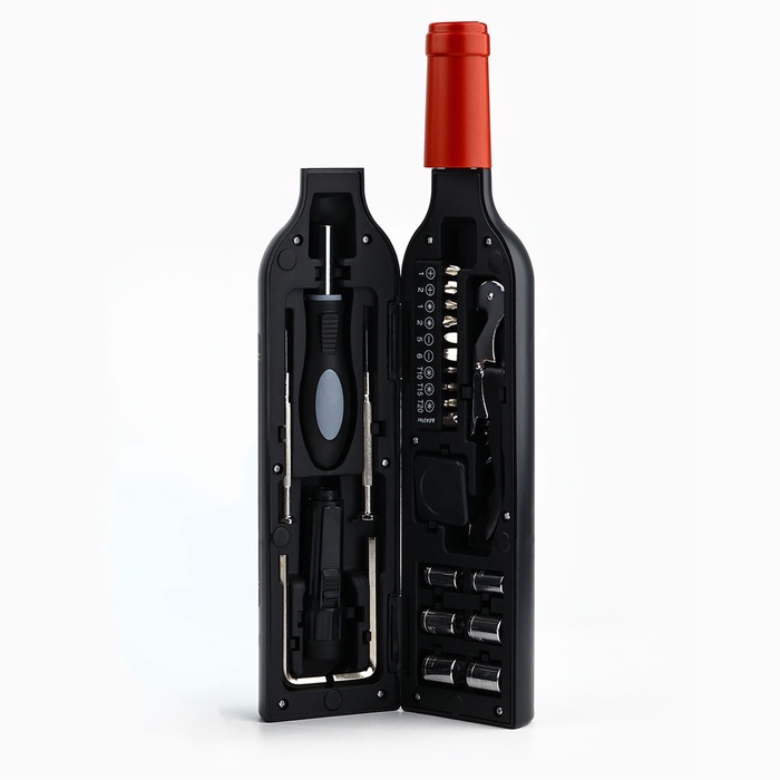 | Составляющие набора | Шестигранник, Рулетка, Держатель бит, Торцевая головка, Отвёртка, Биты, Фонарик, Штопор |