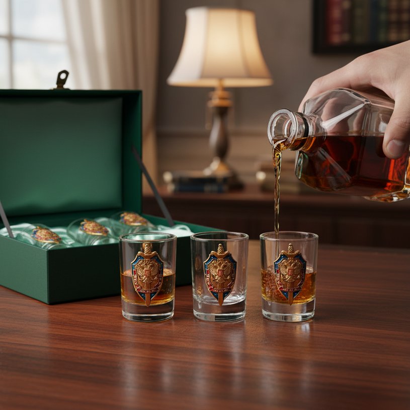 ✓ штофы с гравировкой. Посуда для исконно русского спиртного напитка обладает уникальными особенностями. Наши модели изготовлены из качественного толстого стекла, имеют устойчивое дно, сохраняя прохладную температуру водки на длительное время. Через узкое горлышко удобно дозировано наливать обжигающую жидкость в стопки. А тематическая гравировка, герб или символика ФСБ на стенке сосуда сделают подарок ещё более актуальным и подходящим под праздники, посвящённые спецслужбам.
