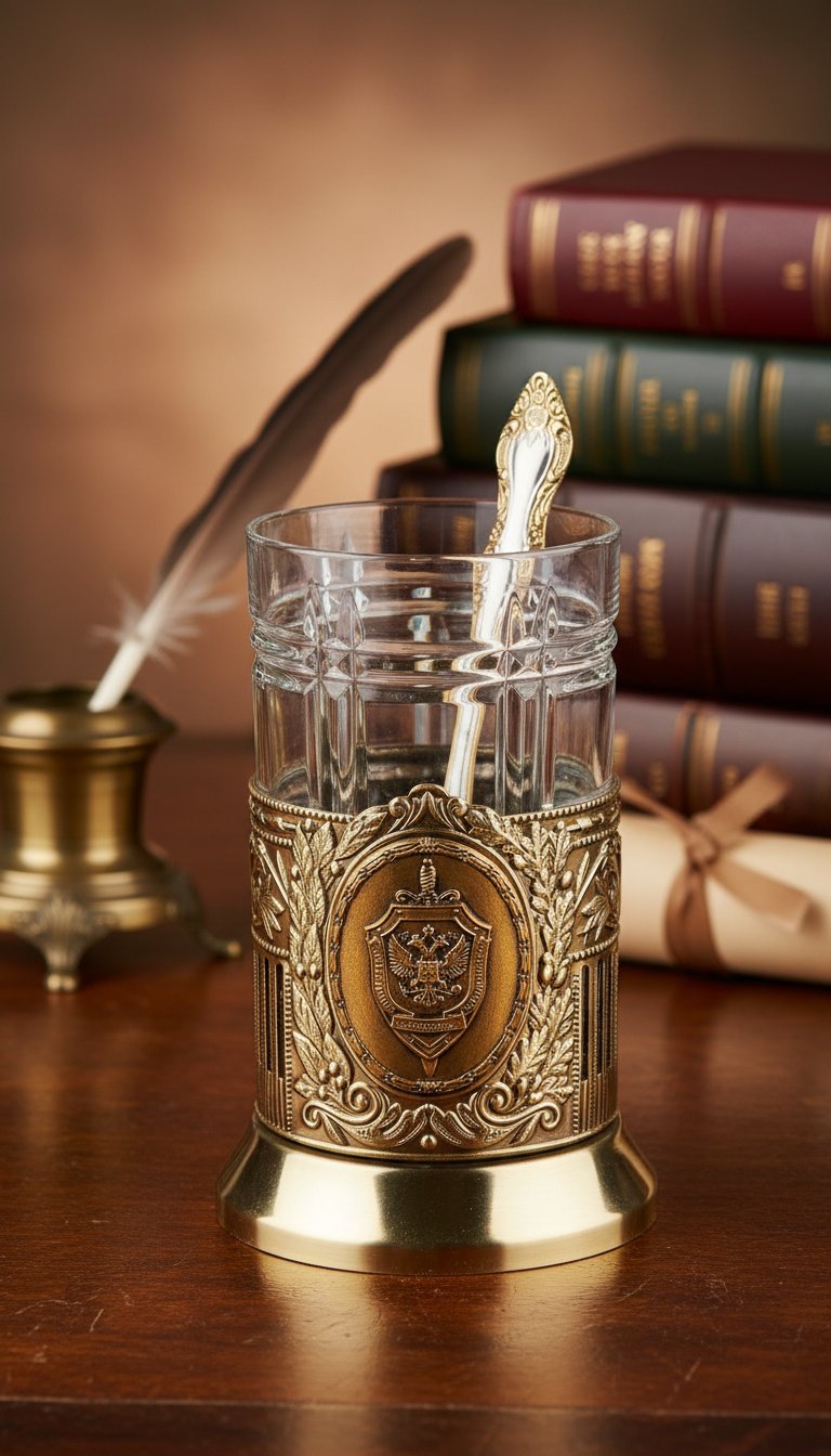 Подстаканник – центральный предмет в застольном комплекте. Он изготовлен из специального латунного сплава по технологии точной художественной штамповки. Поверхность подстаканника покрыта изящным орнаментом, в который вписан барельеф с гербом российской Федеральной службы безопасности.