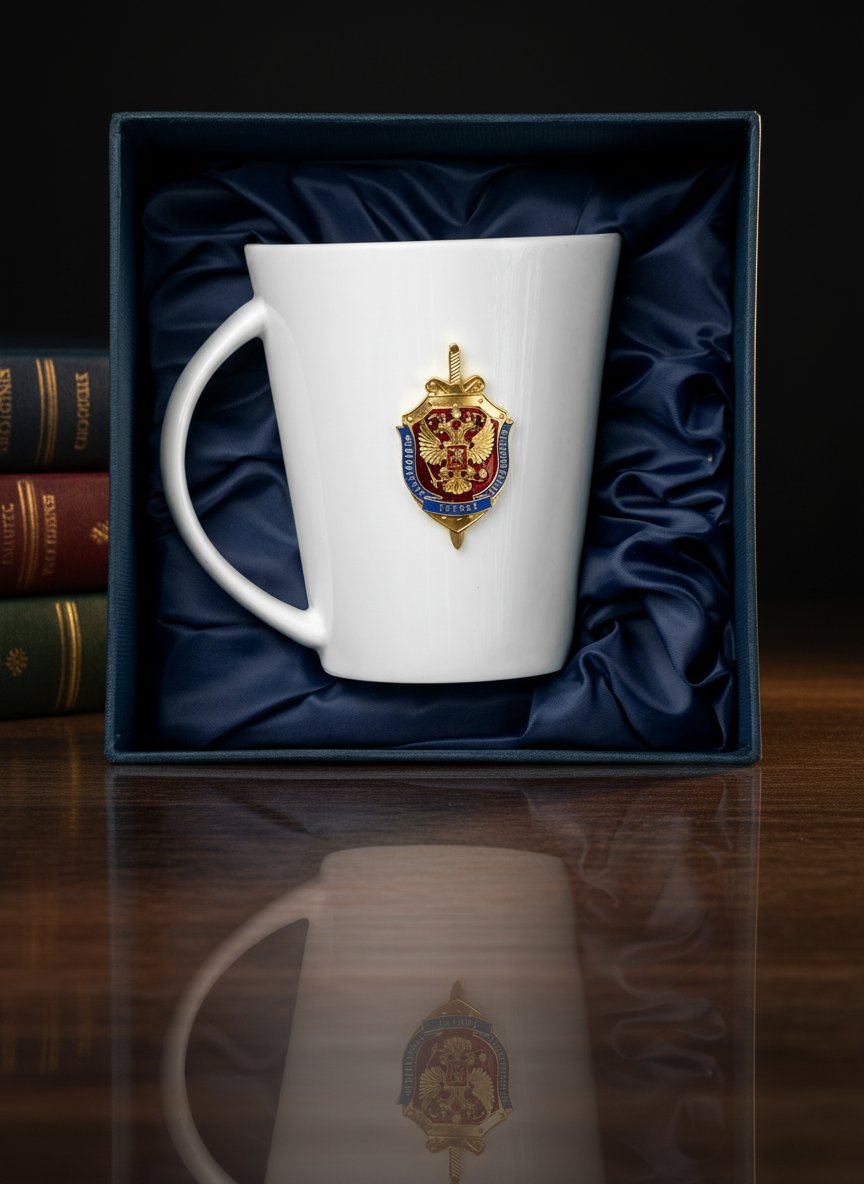 Внешний вид кружки в значительной степени задается и определяется впечатляющим металлическим барельефом, который надежно закреплен на лицевой стороне предмета. Накладка изготовлена из сплава на основе алюминия по технологии точного художественного литья в форме герба ФСБ – меча, щита и находящегося на его фоне российского двуглавого орла. Полировка, гальваническая отделка и покрытие полупрозрачной цветной эмалью придают барельефу особую колоритность.