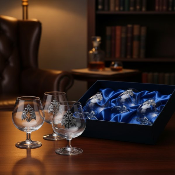 Подарок укомплектован тремя бокалами для коньяка классической формы — широкое дно бокала оптимально ложится в ладонь, позволяя нагреть содержимое сосуда до температуры человеческого тела, при котором букет вкуса и аромата раскрывается максимально полно, а широкая ножка сохраняет безупечную устойчивость бокала на поверхности.