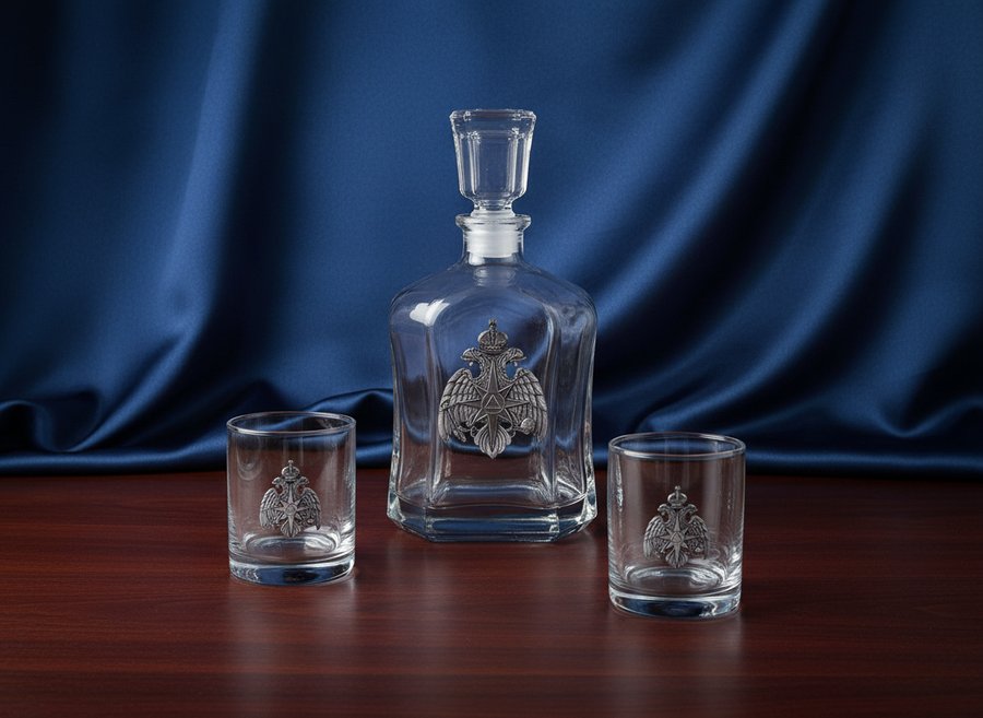 Барельефы на бокалах и штофе в подарочном наборе «МЧС» изготовленвы в виде эмблемы Министерства РФ по чрезвычайным ситуация, где за основу был взят символ, известный как Белая Звезда Надежды и Спасения.