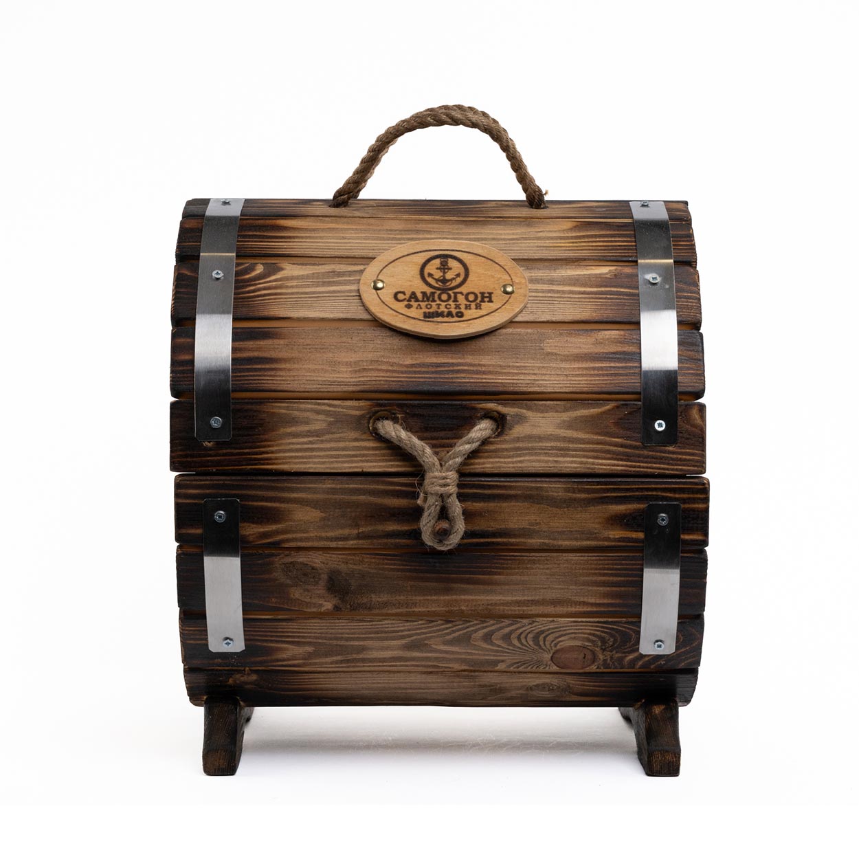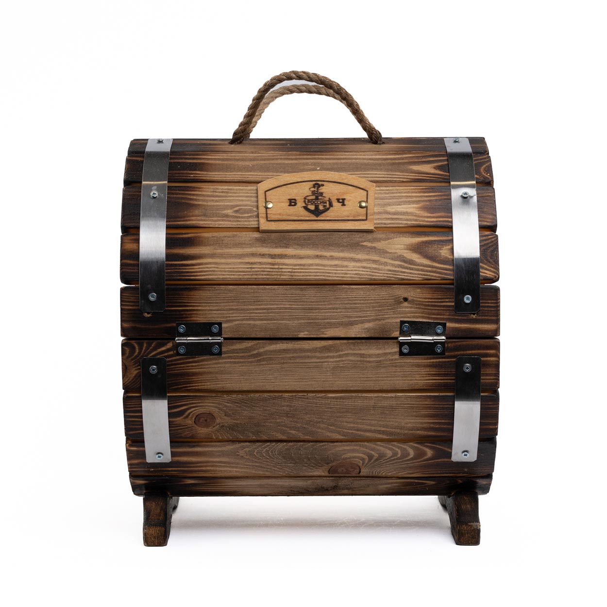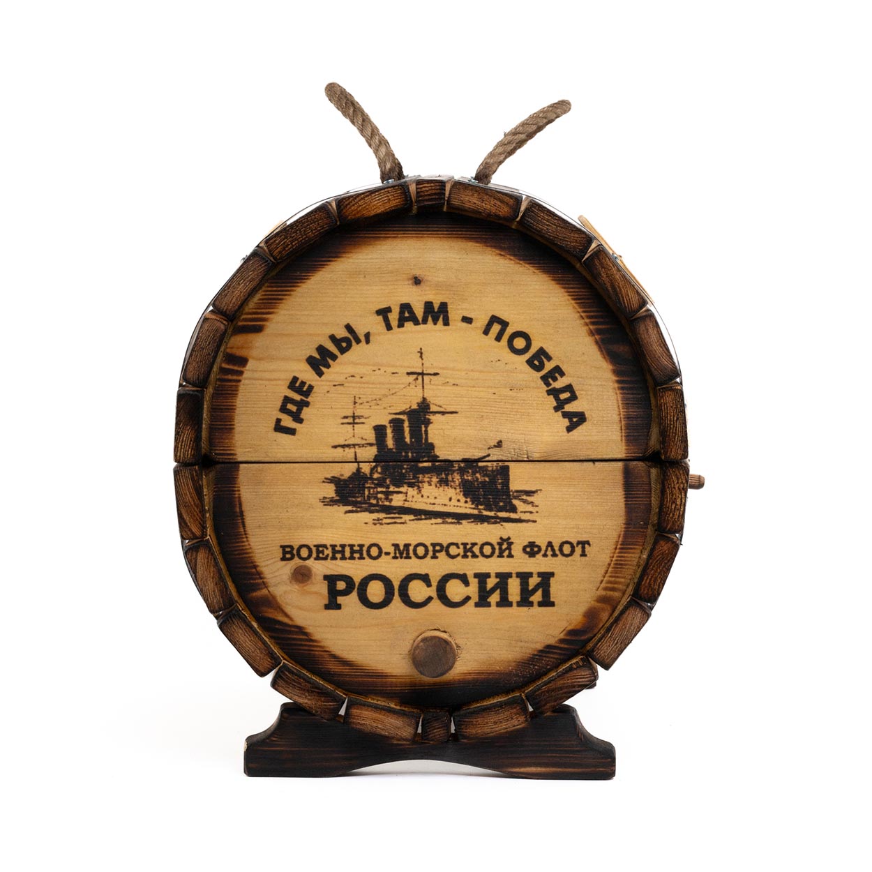 Впечатляющее наружное оформление мини-бара «Флотский» производит очень сильное впечатление. Его торцы украшены изображениями и текстом, нанесенными классическим методом горячего клеймения. На одном из них изображен военный крейсер, обрамленный надписями «Где мы, там победа» и «Военно-морской флот России». На другом присутствуют советский флаг, фигура моряка и надпись «БЧ-1 Самогон флотский» в стильной рамке.