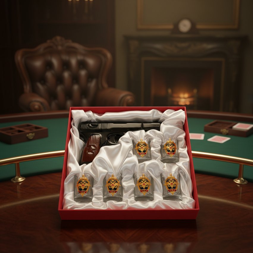 Представленный комплект весьма необычен и по составу, и по своему дизайну. В набор входят шесть граненых стопок объемом 50 мл и фарфоровый штоф, который имитирует известный многим, а особенно сотрудникам при исполнении, пистолет Макарова. Только представьте, насколько интересно и своеобразно будет выглядеть стол с таким предметом посуды! Такая сервировка особенно придется по душе сильной половине, потому как набор символичен, он олицетворяет мужество, смелость, твердость духа. Нужно отметить, чтобы сходство было максимальным, фарфор окрашен в цвета, схожие с цветами настоящего пистолета, это делает его очень реалистичным. Так что будьте осторожны, ведь говорят, что даже палка стреляет раз в год.