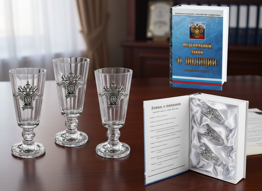 Набор лафитников «Закон о полиции» — оригинальный подарок представителю правопорядка, который и уважение к профессии подчеркнет, и ручной работой потешит, и эффектным дизайном удивит друзей застольных.