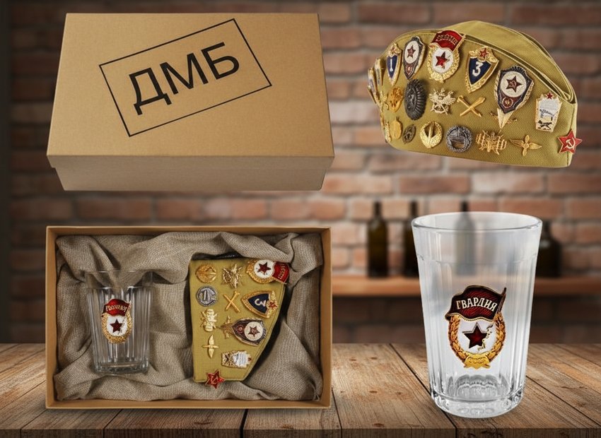 Простой, но оригинальный набор «Дембель» состоит двух предметов: стеклянного граненого стакана и пилотки. Головной убор символизирует, что пришло время сбросить армейскую форму, а вот стакан явно укажет на срочную необходимость отметить это дело!