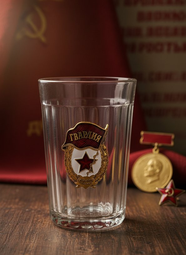 К слову, на стакане есть особая «отметка», дающая понять, что это часть презента для дембеля. Речь идет о цветной алюминиевой накладке «Гвардия», изображающей развевающийся флаг и красную звезду. Золотисто-красное оформление в сочетании с белым цветом смотрится очень празднично.