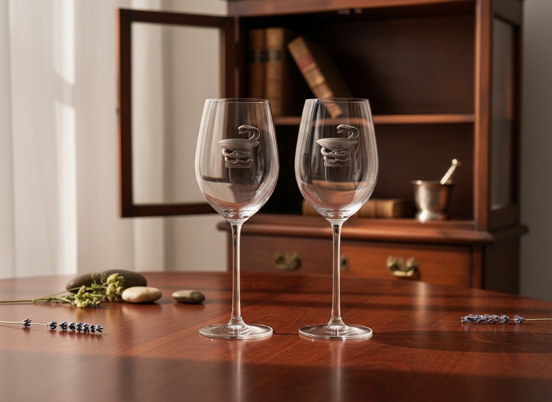 Представленный набор включает в себя два изысканных сосуда, возвышающихся на высокой утонченной ножке и имеющих объем 540 мл. Бокалы для вина изготовлены из высококачественного стекла с гладкой структурой. А форма подарочных изделий напоминает очертания тюльпана. При этом дизайн выполнен в сдержанном классическом стиле, где ударение сделано на уникальный металлический декор. Он изображён в виде самой известной медицинской эмблемы – сосуда Гигеи, где змея обвивает широкую чашу.