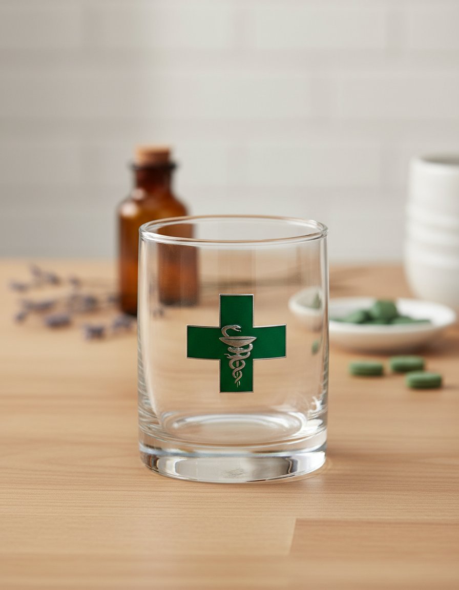 Главным наружным украшением бокалов служит барельеф, нанесенный на их лицевую сторону. Он выполнен по технологии точной художественной отливки из пьютера – 95-процентного оловянного сплава. В декоративном рисунке барельефа воплотилась медицинская символика – крест и обвитая змеей чаша. Поверхность металлической накладки отполирована и дополнительно обработана высокотехнологичным чернением, которое придает деталям барельефа вид уникального антикварного серебра.