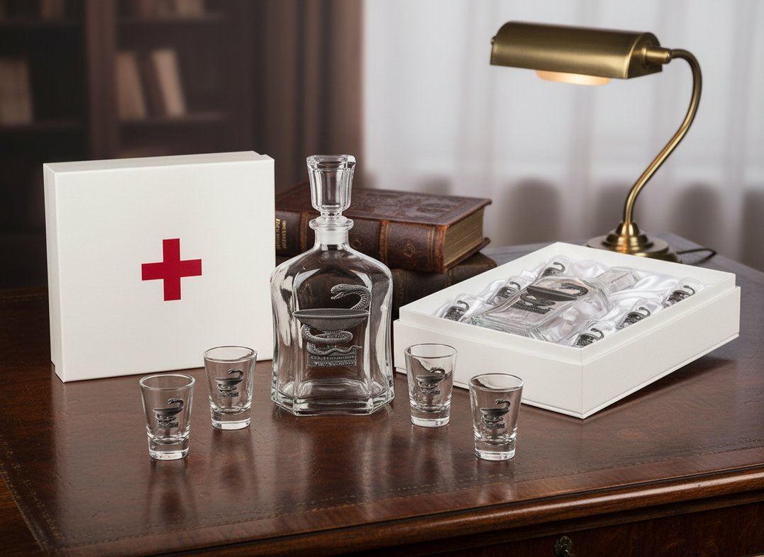 Завершает подарочную композицию необычная упаковка, выполненная в виде медицинской аптечки белого цвета с характерным красным крестом на крышке. Коробка изготовлена из плотного картона, а внутри дополнена атласным ложементом белого цвета, что является символичным признаком благородной профессии и наиболее выгодным способом подчеркнуть серебристый декор сосудов.