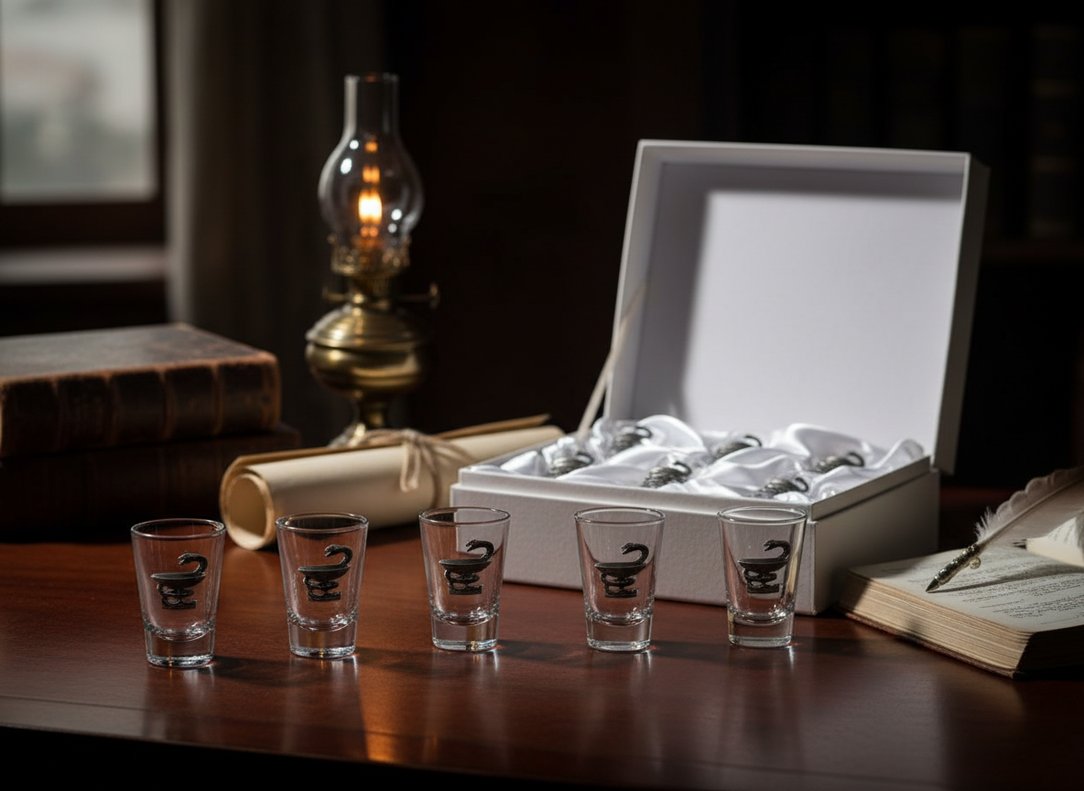 Набор для врача «Секрет Долголетия» состоит из стопок для водки, выполненных из чешского стекла. У них довольно необычная форма: стопки имеют прямоугольную форму с чуть расширенным горлышком. Утолщенное квадратное дно – еще одна особенность дизайна стопок из набора «Секрет Долголетия». Оно позволяет сохранить прохладную температуру напитка даже во время длительного застолья